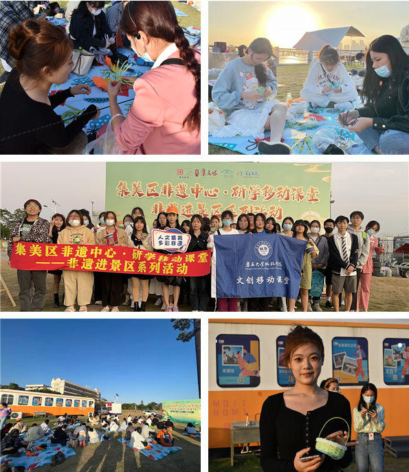 与授牌仪式同步进行的,还有中文专业的特色“文创移动课堂”活动。人文科学系教师王颖和集美塔的老师带领中文学子参观集美塔非遗展馆,近距离感受传统非遗民俗的魅力:在民俗集市厅参观陈氏纸扎、闽南造像、嘉庚瓦、宋江狮等非遗项目;在薰风集雅厅学习歌仔戏、木偶戏、布偶戏等众多闽南戏曲文化,真正实现移动课堂的沉浸式体验,在观展中感受文化精神,从继承中勇于创新。此次“文创移动课堂”还与文创方向的“非遗创意手作工坊”课程进行有机结合,师生们一行乘坐集美特色旅游公交铛铛车来到十里长堤,学习非遗项目藤编技艺,动手完成藤编提篮制作。学生刘金睿表示,此次文创移动课堂的收获特别大,在学习非遗文化的同时了解集美文化旅游项目,加深了对专业知识和行业需求的认知。