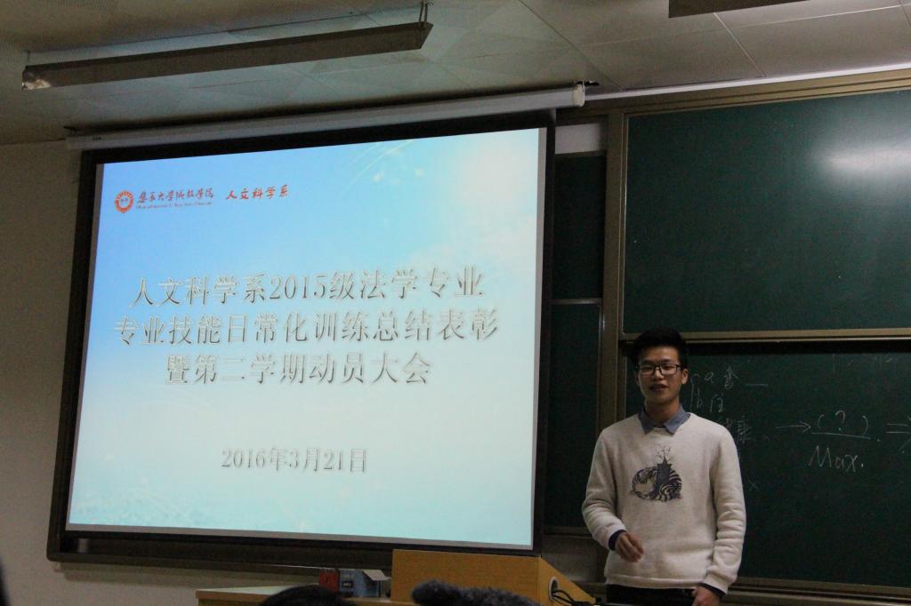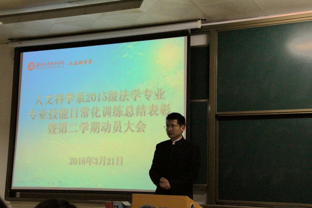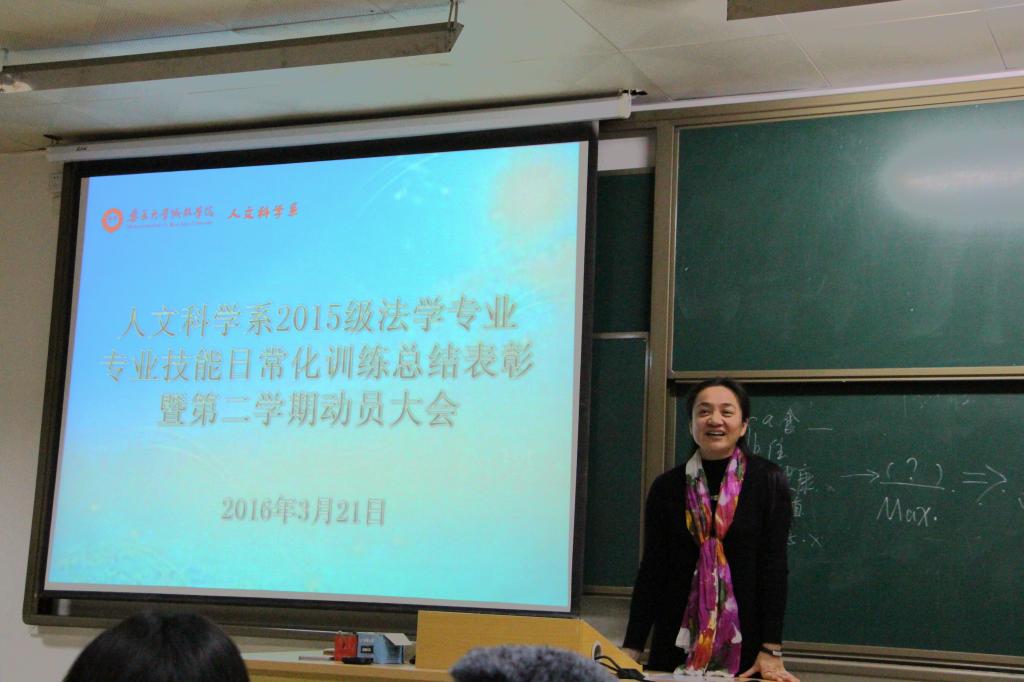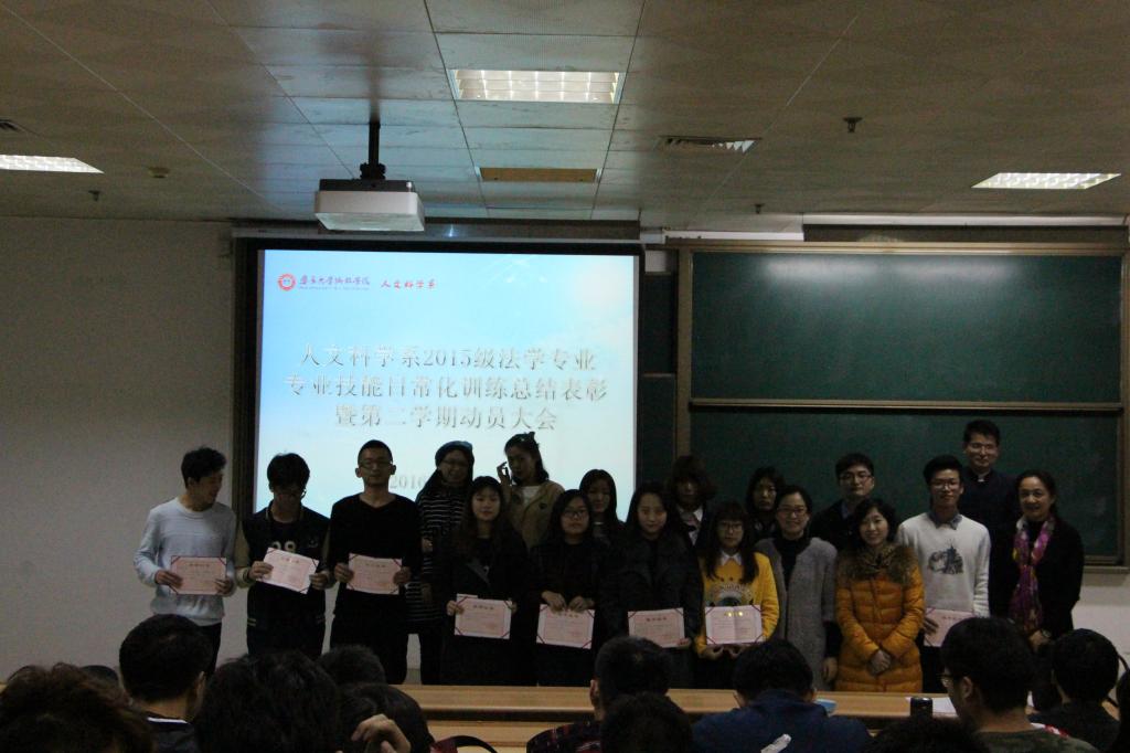 3月21日,我院人文科学系2015级法学专业技能日常化训练表彰大会在教学楼9#201举行,出席本次活动的有人文科学系党总支部书记涂静萍、法学教研室主任陈明祥副教授、陈娟辅导员以及各任课老师。