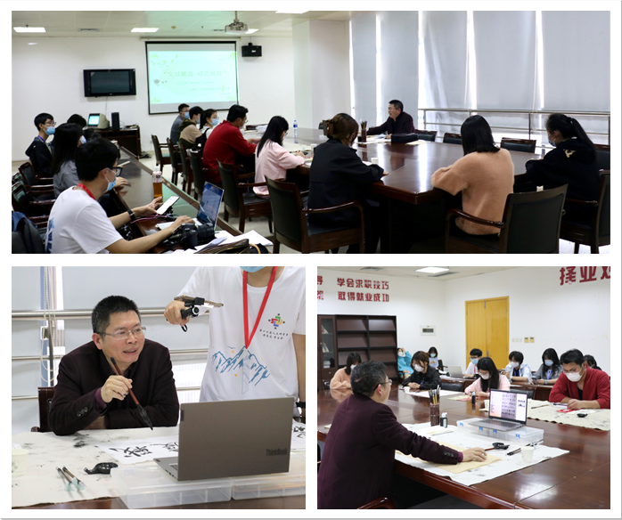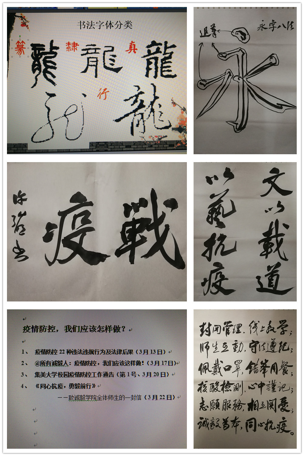 宣讲会开始,许弘明介绍了当下疫情防控形势的严峻性和复杂性,列举了校院主要防控举措,并以“书法作品”形式引导大家明确要求、齐心协力扎实落实疫情防控各项工作。随后,许弘明为大家上了一堂别开生面的书法课,他以书法的“四法”切入,详细介绍了中国书法的历史渊源、古代十大书法家及其经典作品、学习书法的要领,并现场为大家示范了“永字八法”基本笔法。他还对同学们的书法作业进行了细致的讲评,鼓励大家“文以载道,以艺抗疫”,在封闭管理期间,严格遵守校规校纪、积极参与系里的“春日抗疫”作品征集活动。他展示了《入党誓词》《国歌》《校歌》书法作品,希望大家培育“三爱”情怀,担当起青年大学生们应有的责任与使命。