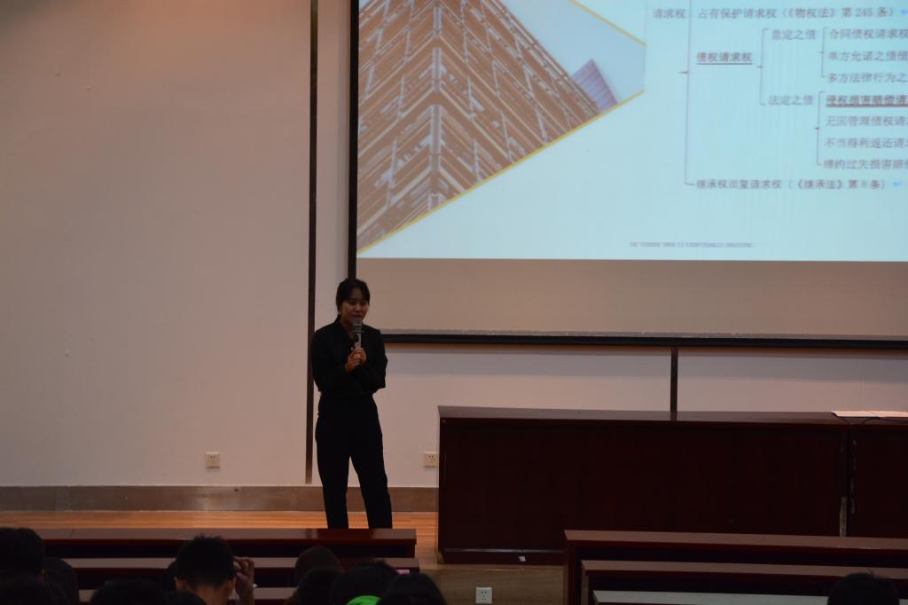 在讲座中,马春辉老师简要介绍司法考试改革动向、卷面分数比例以及如何合理制定复习计划,其中重点讲解刑法备考中应以刑法二阶层犯罪论体系为核心,真题为导向,把握刑法知识重难点然后再辅以真题。稍后林英老师上台为即将面临考研和司法考试抉择的同学做了详细解答并重点讲解了民法中的物权请求权和侵权请求权两个重点知识。