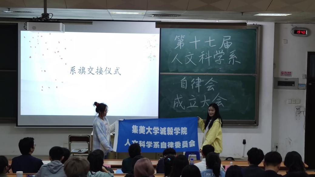 一段简短的自律会宣传视频拉开了会议序幕。自律会指导老师董培辉首先发言,他对21级新生干事的加入表示欢迎,并对自律会学生干部提出了“正态度、定好位、努力学习、甘于奉献”四点要求。紧接着,辅导员老师王云宣读了第十七届系自律会学生干部名单,随着象征着“自律自强,乘风破浪”的蓝色会旗在新老主席手中交接仪式的完成,新一届系自律委员会宣布正式成立。成立大会上,上届主席李凯茵分享了个人三年自律会工作经历与收获,新一届主席杨昀轩向全体成员作了工作计划与要求,干部代表陈槟分享了新干事工作方法与技巧,新生干事代表梁景飒表达了对自律会工作的憧憬与期待,她们的发言鼓舞了全体成员团结一致做好自律会工作的决心,相信新一届自律会一定能继续乘风破浪,扬帆远航。