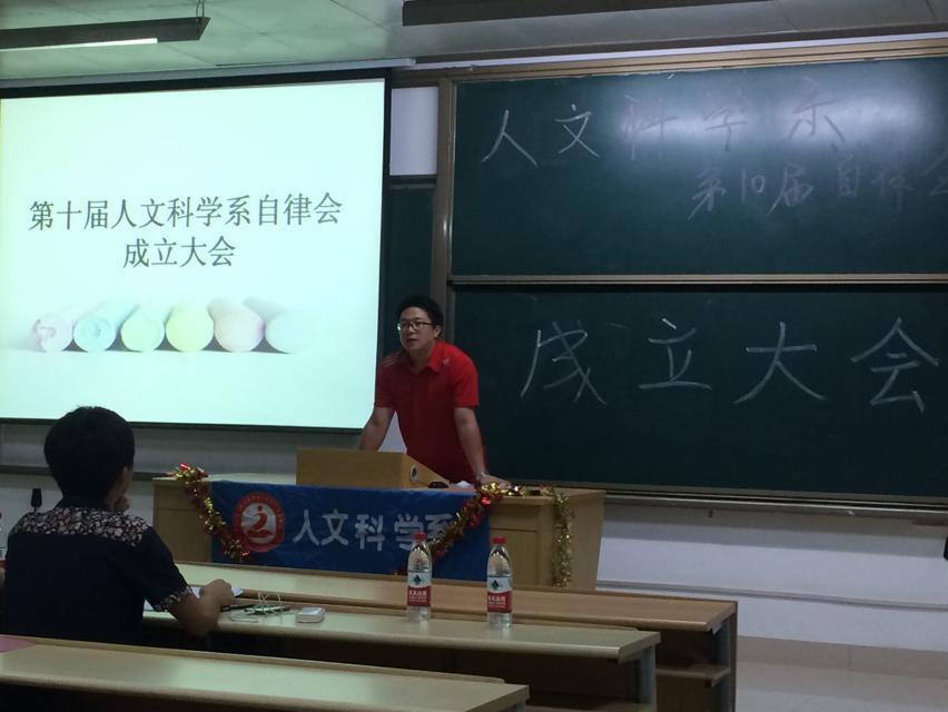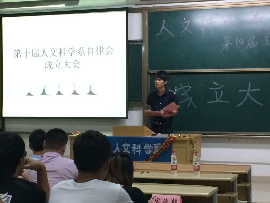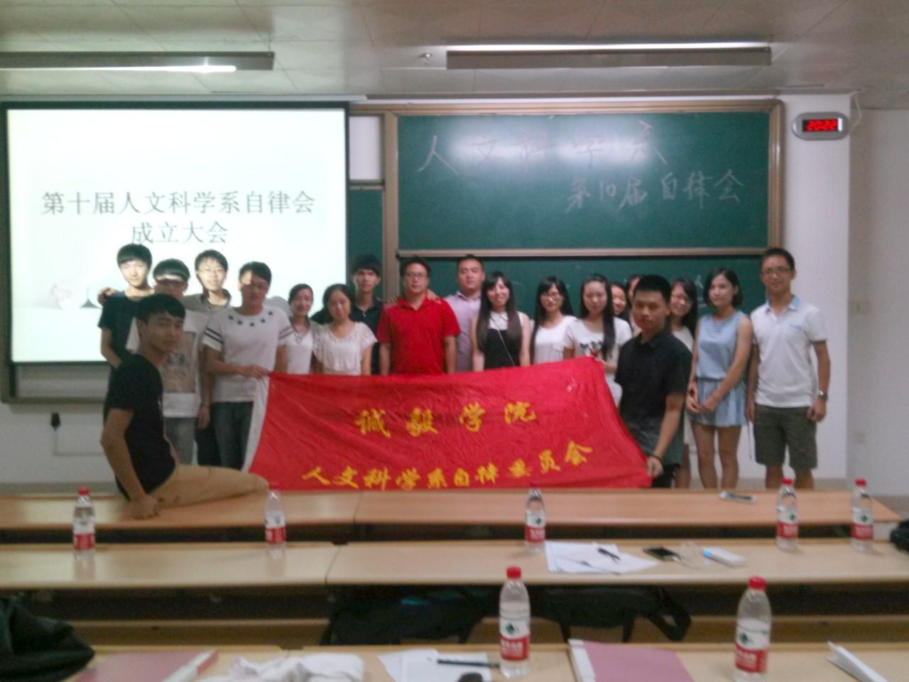2014年9月17日晚,诚毅学院教学楼3号楼207,第十届人文科学系自律会成立大会拉开帷幕。出席此次大会的嘉宾有自律会指导老师骆伟堂、前主席吴小旭、学生会代表、法律践行社代表,以及第十届人文科学系自律会全体干部、干事。大会由新一届干事代表杨宏飞、叶蓓主持。