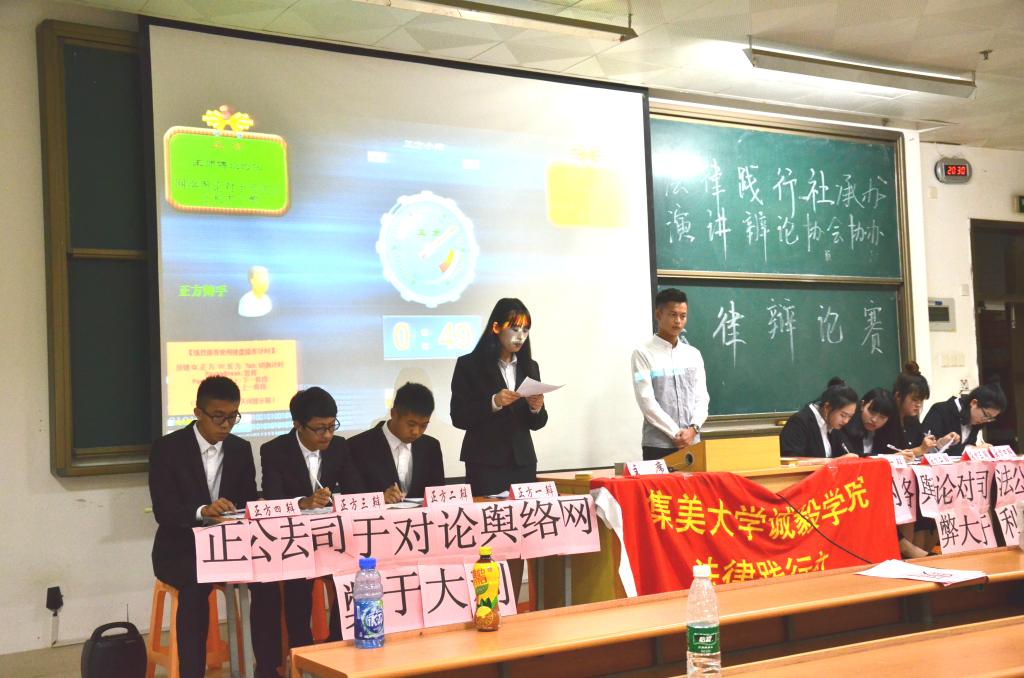 12月23日晚,由法律践行社承办、演讲辩论协会协办的法律辩论赛决赛在教学楼4#401举行。辩论赛有幸邀请到了集美大学法学院肖金发教授、人文科学系办公室主任兼法律践行社指导老师靖耀老师、诚毅学院院辩论队队长宁志松担任评委。此次辩论赛吸引了同学们的广泛关注,各专业学生踊跃报名,热情参与。