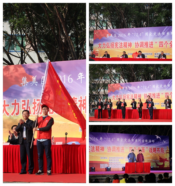 近日,集美区2016年12.4国家宪法日系列宣传活动在集美区霞梧广场成功举办。本次活动由集美区委宣传部、区依法治区办公室、区教育局、区司法局、侨英街道联合主办。区委常委、宣传部长赖朝晖,区委常委、政法委书记杜刚,区人大常委会副主任邱晓晖,区政协副主席陈小强,区司法局局长王在军等有关领导同志出席本次活动。我院由人文科学系辅导员陈娟老师带队的2015级法学专业全体同学和法律践行社全体成员参与本次活动的协办工作。