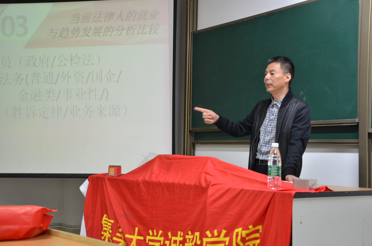 2016年4月20日晚,法律践行社特邀北京惠诚律师事务所上海分所副所长钱沛鑫律师到集美大学诚毅学院开展了一场关于法律人未来规划设计的讲座,到场的有法学专业13级、14级的同学和海商法专业14、15级的同学,同时到场的还有法学专业13级刑法学吴贵森老师。