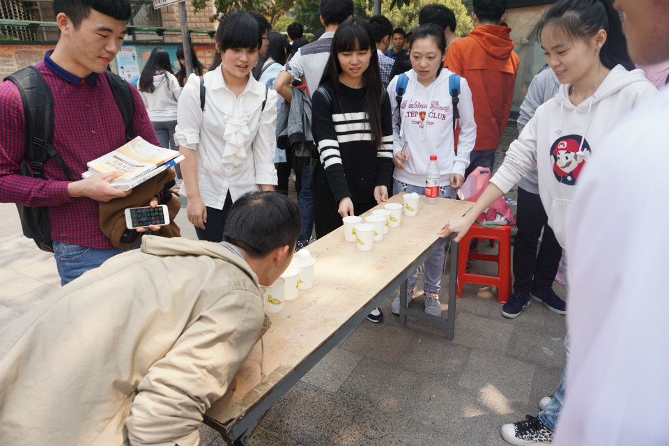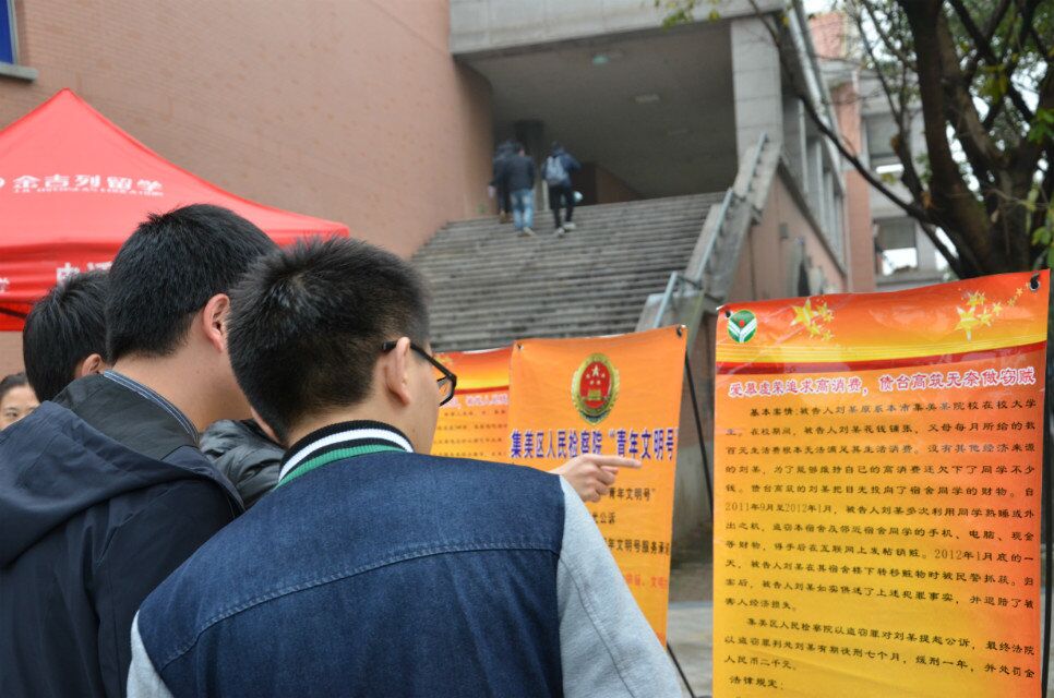 2015年3月17日,315校园普法在食堂对面中心小广场正式展开了。此次活动由法律践行社同集美区检察院,集美大学诚毅学院法学教育实践基地联合开展。活动现场还请来了集美区人民检察院的郭太山和张蕊两名检察官到现场为同学们解答有关法律方面的疑问。整场活动设置了3个游戏环节,分别是“抛圈子”、“一鼓作气”、“射飞镖”。每个参与游戏的人在游戏前要学习朗读一条《劳动法》、《消费者权益保护法》或者《侵害消费者权益处罚办法》的相关条文。同学们认真的朗读法条,学习法律。活动现场热闹非凡。
