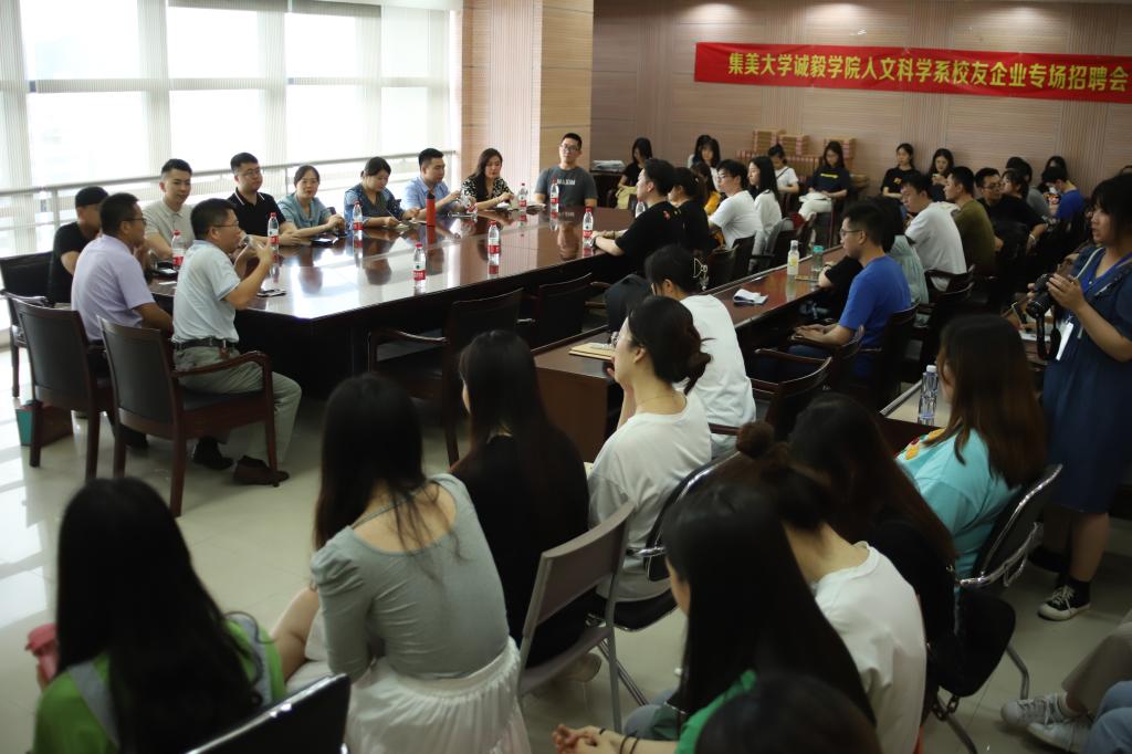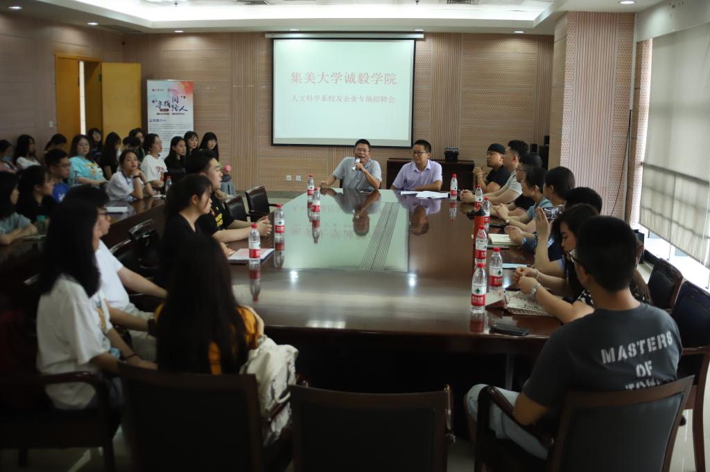 6月9日下午3时,集美大学诚毅学院人文科学系校友企业专场招聘宣讲会在景祺楼16楼会议室召开。本次招聘宣讲会邀请了悦诗文化创意有限公司、兴业证券泉州分公司、临家餐饮集团、四大名补教育、七尚酒店共五家校友企业,为我校2021届毕业生提供了大量优质的就业与实习岗位,受到了热烈欢迎与响应,人文科学系书记许弘明和系办公室主任靖耀老师出席宣讲会。