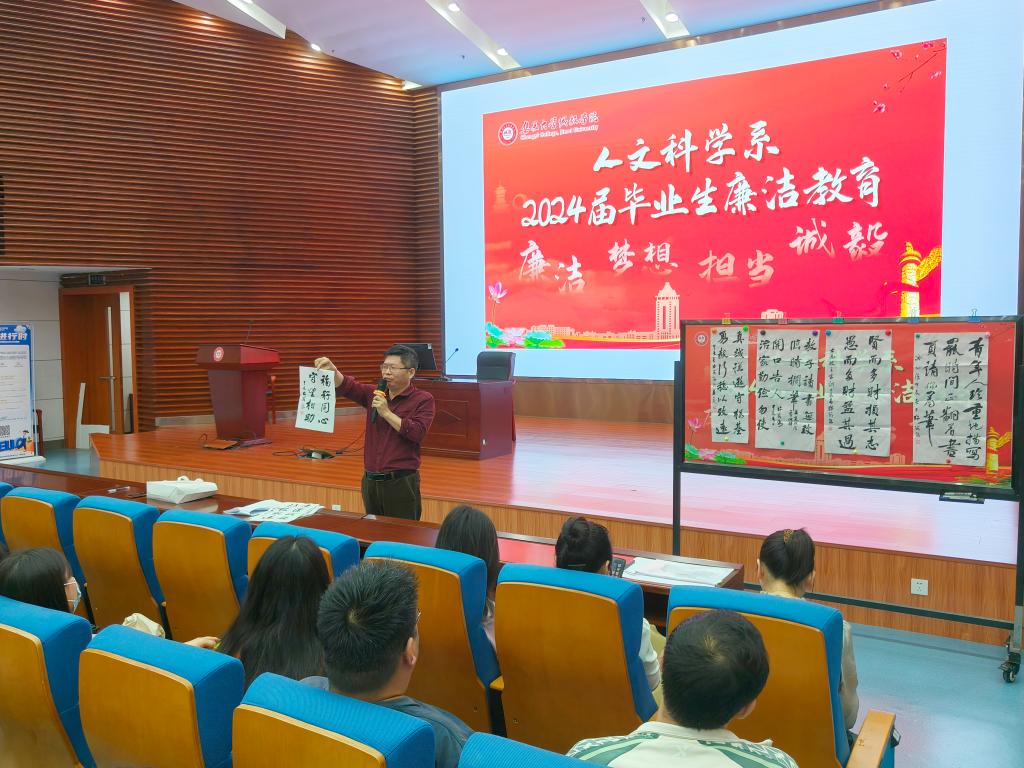 为深入开展学习贯彻习近平总书记关于党纪学习教育的重要讲话和重要指示精神,帮助毕业生扣好廉洁从业的“第一粒扣子”,共育“五廉”新风。4月25日,人文科学系以“廉洁,梦想,担当,诚毅”为主题关键词召开毕业生教育大会,系党委书记许弘明、毕业班辅导员和全体毕业班学生出席本次会议,会议由系党委组织员陈琪主持。