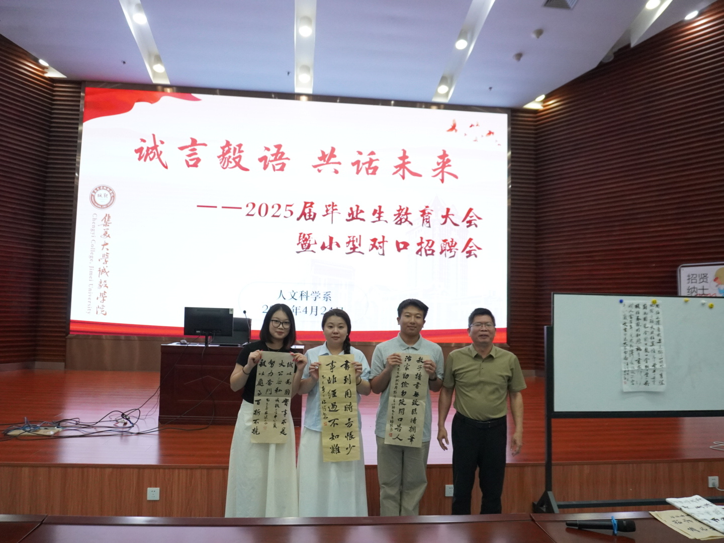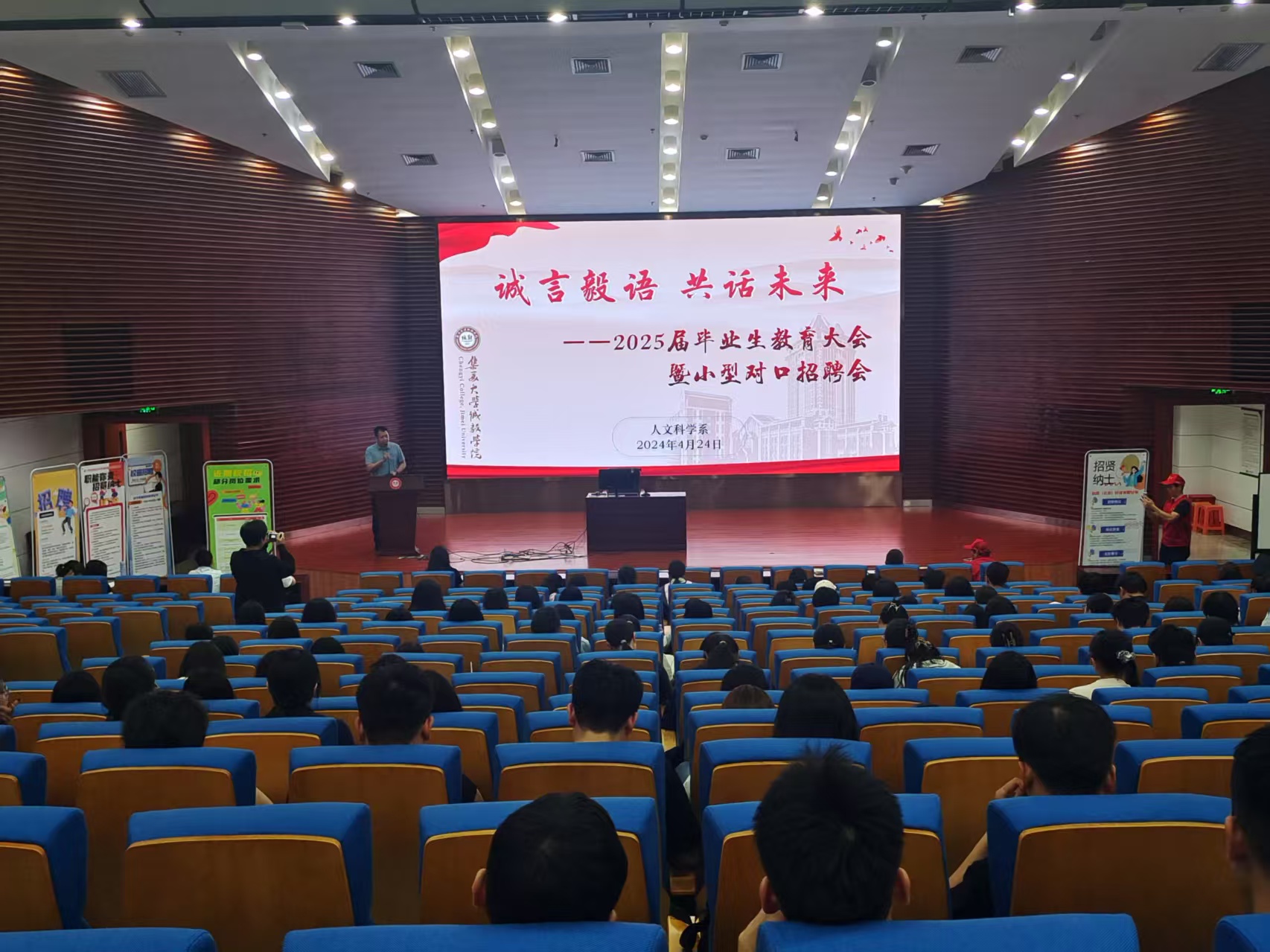 4月24日,我系在景祺楼104报告厅召开“诚言毅语,共话未来” ——2025届毕业生教育大会暨小型对口招聘会。中国通俗文学艺术终身奖获得者、央视百家讲坛特邀讲师、集美区委宣传部讲师团讲师林忠阳,系党委书记许弘明,相关人员及2025届毕业生参加本次会议。会议由系党委组织员陈琪主持。