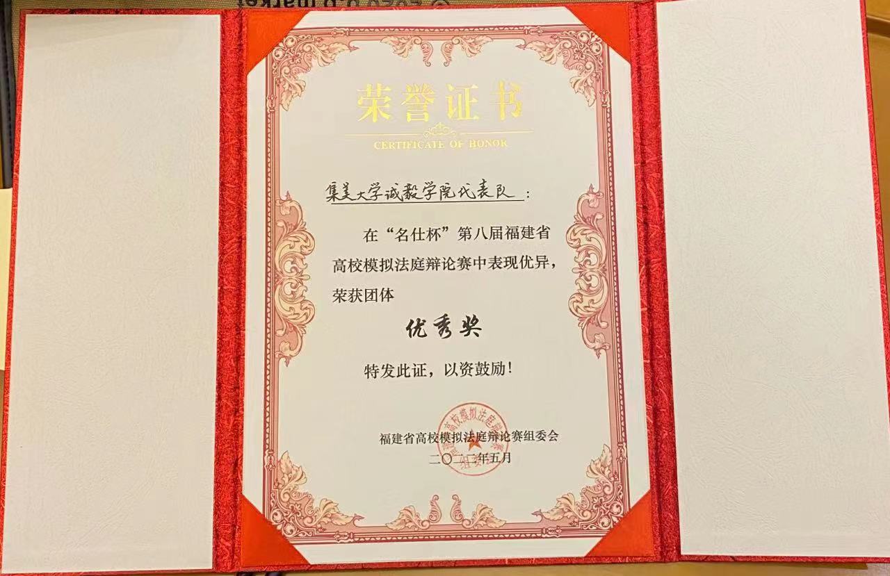 5月29日上午,由福建省教育厅主办,福建师范大学、福建省法学会承办的第八届福建省高校模拟法庭辩论赛在福建师范大学落下帷幕。来自全省16所高校代表队参与其中,经过激烈角逐,由人文科学系法学专业徐梦琳、黄薇、吴博炜、高思颖、袁娇娇、刘长俊六位同学组成的集美大学诚毅学院代表队最终荣获团体优秀奖。