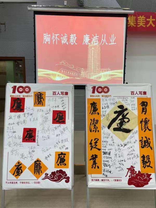随后,毕业生代表张咏带领全体同学宣读《廉洁从业承诺书》:坚定信念,践行核心价值;爱岗敬业,恪守廉洁奉公;廉洁从业,坚守道德底线;胸怀诚毅,实现人生价值。与会同学共同在“胸怀诚毅,廉洁从业”百人写廉宣传板上郑重签上了自己的名字。毕业生代表吴良祯上台发言,他以自身经历为例,感恩母校与恩师栽培,对同学们的帮助与支持表示感谢;通过分享自身故事,鼓励同学们坦然面对今后的压力与挑战,“翻过这座山,就是新的故事”,从小事做起,脚踏实地,积跬步以至千里,积小流以成江海。