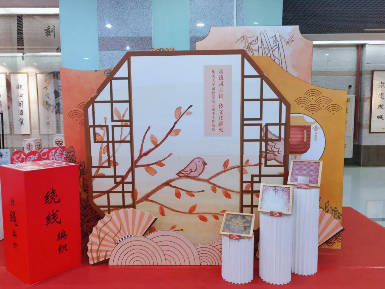 2021年11月20日上午,集美大学诚毅学院非遗手工作品展在景祺楼一楼大厅顺利开展。本次展览主题为“承遗风古训,传文化薪火”,共展示超过200件非遗手工作品。它们均出自人文科学系汉语言文学专业(文化创意方向)师生之手,包含剪纸、盘纸、掐丝珐琅、蜡染、草木染、竹藤编织、结绳编织、绒花、中国结、布贴画、绕线编织、刻纸等12种非遗技艺。