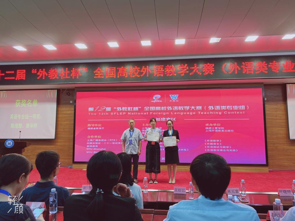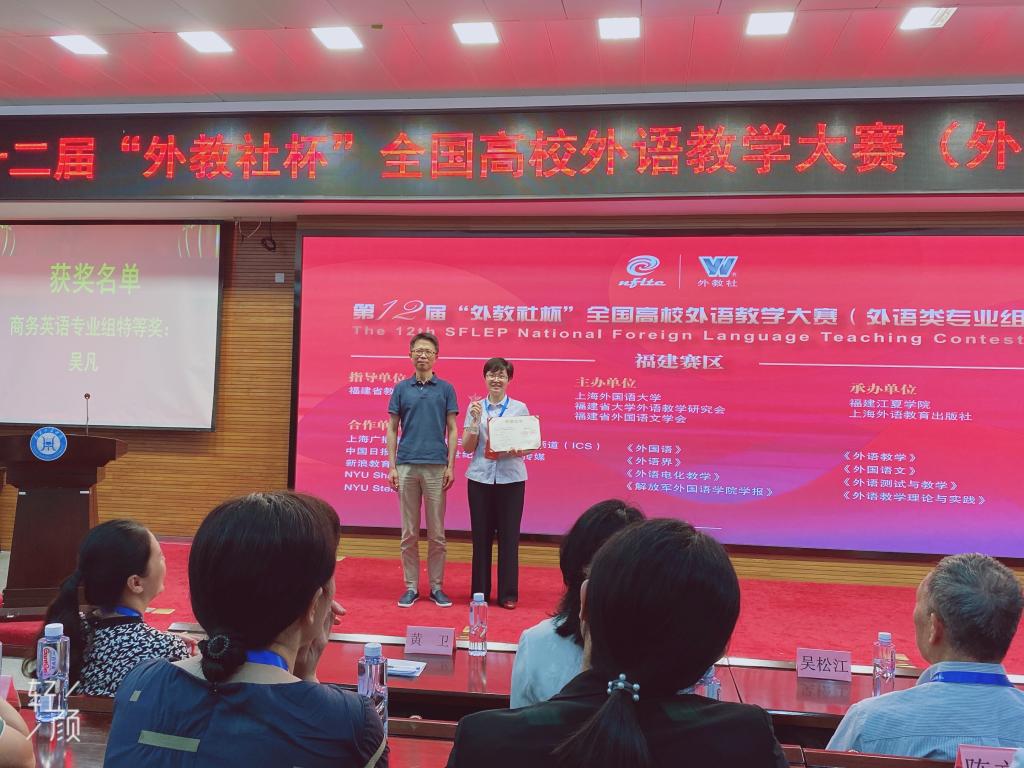 6月27日,第十二届“外教社杯”全国高校外语教学大赛(外语类专业组)福建赛区比赛在福建江夏学院落下帷幕。我院人文科学系陈理慧老师及吴凡老师代表诚毅学院参赛。本次大赛有来自省内16所高校共21位教师参赛。经过两天的激烈角逐,最终,我院吴凡老师获得商务英语组特等奖,陈理慧老师获得英语专业组一等奖。吴凡老师将代表福建赛区参加12月在上海举行的全国决赛。