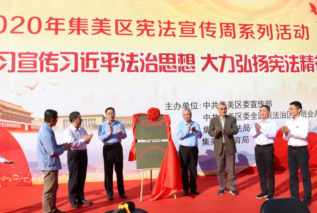 12月3日下午,在杏林文体中心广场举行的2020年集美区宪法宣传周系列活动上。举行了集美区普法志愿者联盟基地授牌仪式,院党委副书记颜承志代表学院揭牌并发表了讲话。本次活动由中共集美区委宣传部、中共集美区委依法治区办公室、集美区司法局、集美区教育局联合主办,主题为 “深入学习宣传习近平法治思想,大力弘扬宪法精神”。