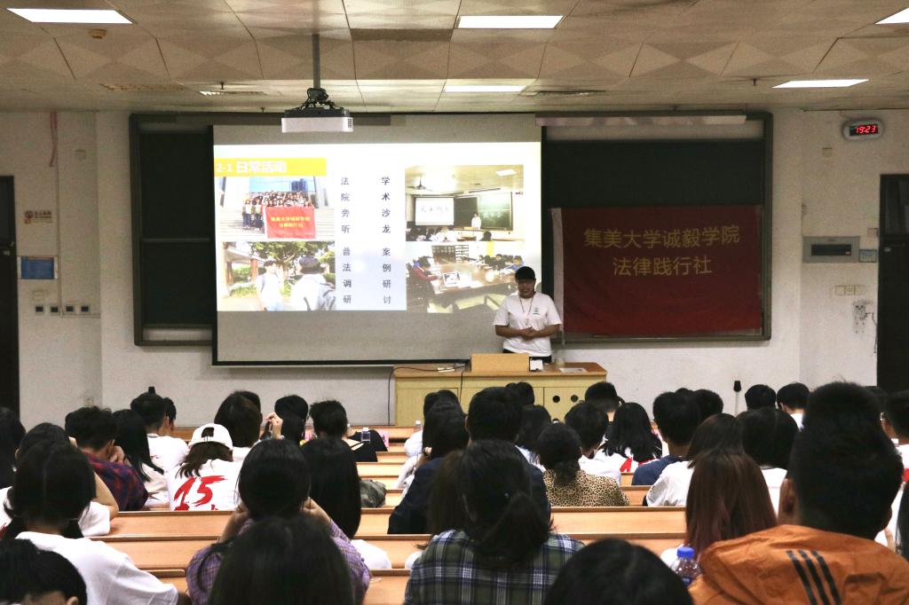 活动开始先由社长张咏从社团的概况、精神、宗旨等方面对整个社团进行介绍,并对社团本学年的活动如读书沙龙、以案说法、模拟法庭等等进行展望,无不彰显社团的特色。之后由各部门部长上台讲解各部门职能,全方面的让同学们对我们社团有更深入的了解。