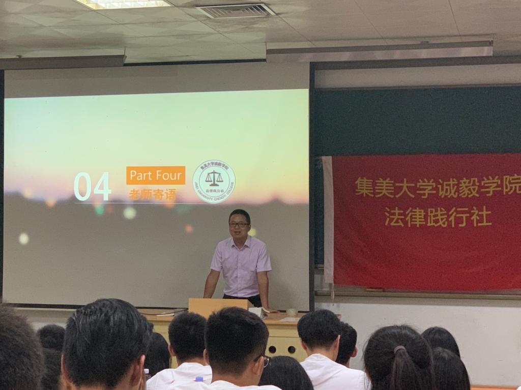 之后由法律践行社第十四届社长王伟鸿和第十三届副社长肖兴鸿进行寄语,两位社长通过讲述自己亲眼见证的每一届成员个人能力与专业的进步,以及部门的成长过程,向新成员们传递坚持、认真负责的态度。