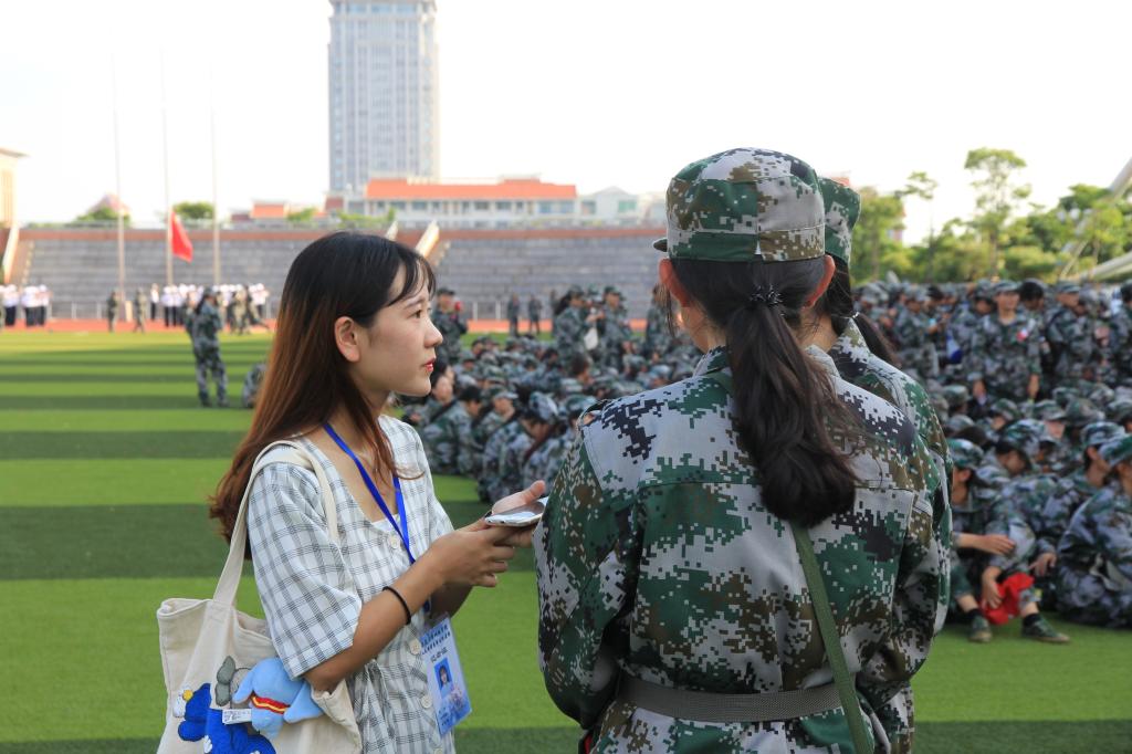 来自人文科学系英语专业的钟嘉妮是千人方阵中的一员,接受采访时,她刚刚排练结束,汗水还在她的脸上流淌。在谈及对于千人方阵这个军训表演有何感想时,她和我们分享到:“能成为千人方阵中的一员,自己感到特别的荣幸。每次排练时,看到大家整齐划一的动作,总会觉得这几天流的汗,晒的太阳值得了。”当问及军训有何收获和体验,她说到:“军训很好的磨砺了自己,让自己变得强大起来。经历了艰苦的军训,在面对一些棘手的事情也会感觉没那么难了。同时自己还收获了友情,每次当自己坚持不下去时,总能收到队友的鼓励,这时就会咬咬牙撑下去。”同样来自英语专业的朱凤杰也同我们分享了她的感想:“军训这些天,无论是辅导员还是学长学姐们,都让她感受到了满满的人文关怀。辅导员会下到每一个连队,关心是否有同学中暑。学长学姐们则会在军训结束后,给大家送水,为我们带来清凉。”