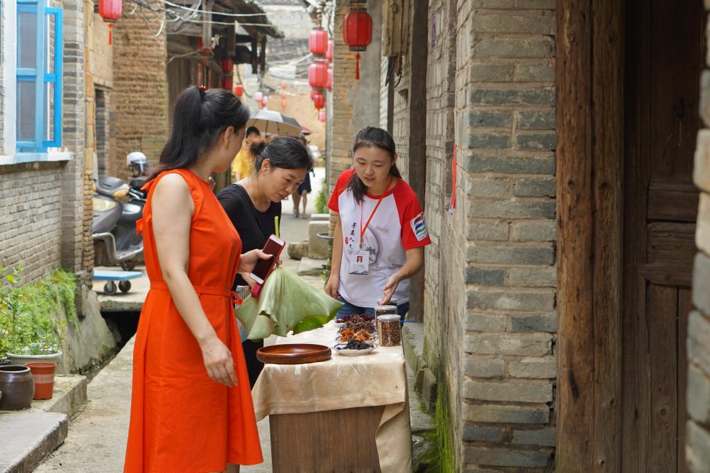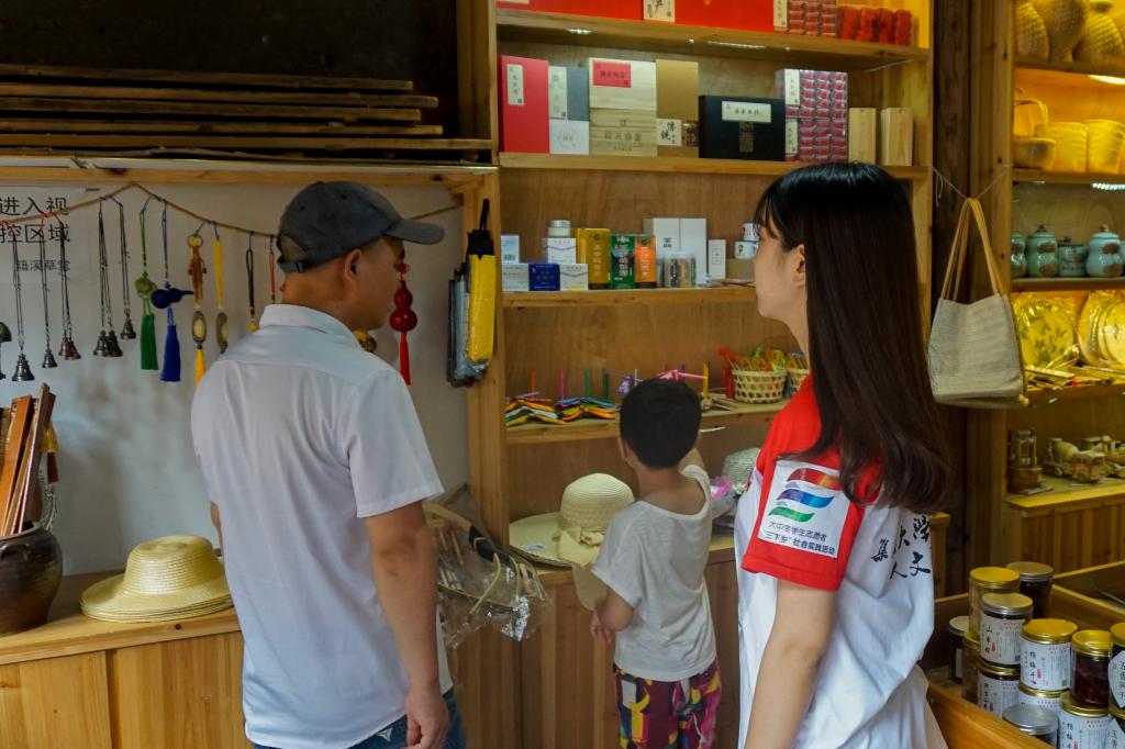 早晨八时许,实践队员们就已到达自己所在的服务点进行准备工作。驻点游客服务中心的实践队员们接待着由全国各地前来五夫镇采风的摄影师,为他们发放手绘地图,并向来往的游客解答疑问,指明车辆停放点并讲解旅游路线的规划。驻点当地农特产品商户的实践队员们协助商户负责人布置活动展台,并从取材、工序、功效等方面为游客进行产品介绍,使游客们更加了解五夫镇的农特产品。驻点当地特色民宿“归来院”的实践队员协助民宿主理人进行访客的接待工作,在游客离开后,还主动收拾并清洗茶壶杯具,保持会客点的干净整洁。“归来院”的主理人玉子对实践队员的志愿服务致以感谢,并对实践队此行的工作表示充分肯定。今日恰逢镇内“诸子窑”开窑,精美的瓷器摆件一一呈现,纷纷引来游客们的驻足参观,驻点“诸子窑”的实践队员在制陶工作室内进行引流工作,以维持游客的参观秩序。在出窑的陶器中,也包括了实践队员于几日前制作的刻有“寻熹人文”字样的花瓶,虽然花瓶外形质朴,但它凝聚着的是“寻熹人文”实践队四年来与五夫镇的深厚情意。