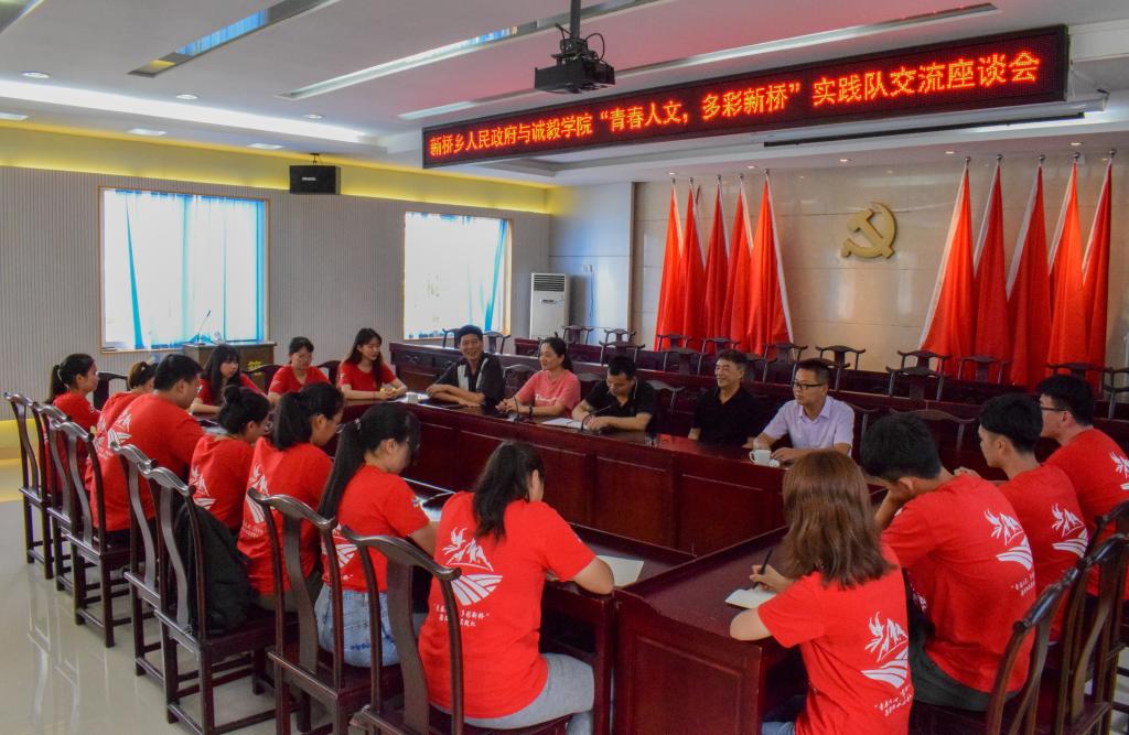 “同学们好久不见!”一道中气十足的声音从新桥乡人民政府会议室门口来。今日上午,诚毅学院副院长兼人文科学系主任朱宝荣老师,人文科学系党总支书记涂静萍老师,系办公室主任靖耀老师以及中文教研室主任王锡明老师前往新桥慰问实践队员,那一道声音的来源便是王锡明老师。在乡政府领导到达前,朱院长,涂书记,靖耀老师以及王锡明老师与在座的同学们进行了亲切的交谈。在听完每一位队员五天时间的感受后,朱院长就传统文化和红色文化两点为基础,深入挖掘其中的关系,对新桥乡的红色研学基地建设提出了更多的设想。在此之后,各位赶赴新桥的领导老师们也纷纷发言,在慰问学生的同时进行实践工作的指导。