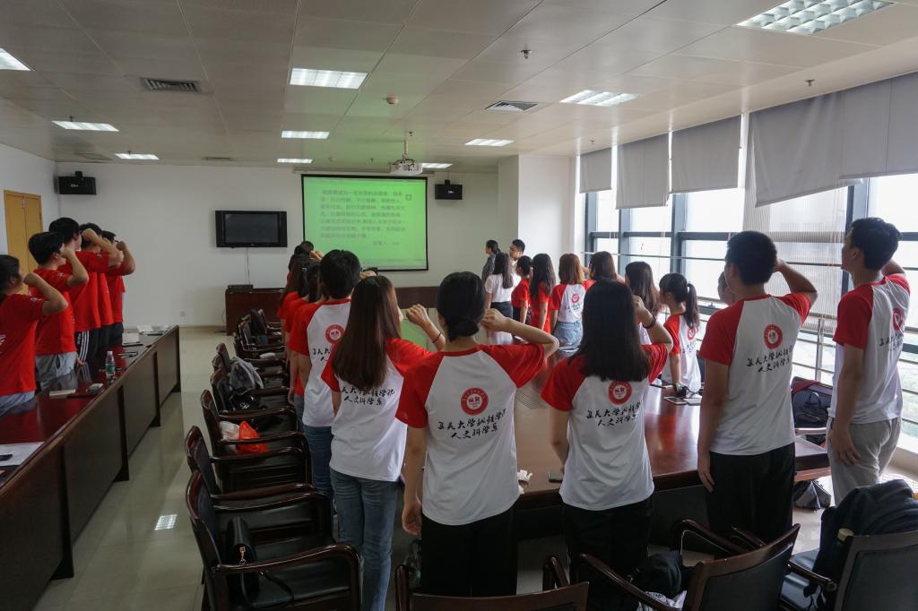 “我愿意成为一名光荣的志愿者,我承诺:尽己所能,不计报酬,帮助他人,服务社会。践行志愿精神,传播先进文化,以最积极的心态,最饱满的热情,认真完成实践任务,展现人文学子风采!为建设团结互助、平等有爱、共同前进的美好社会贡献力量。”动员讲话结束后,全体实践队员进行“宣誓”仪式,用铿将的话语,表达自己的决心。骆伟堂老师对本次会议进行了总结,并对后勤工作做出了补充,希望队员们充分把握实践机会,认真感受红色文化和传统文化的熏陶,展现人文学子良好的精神风貌。