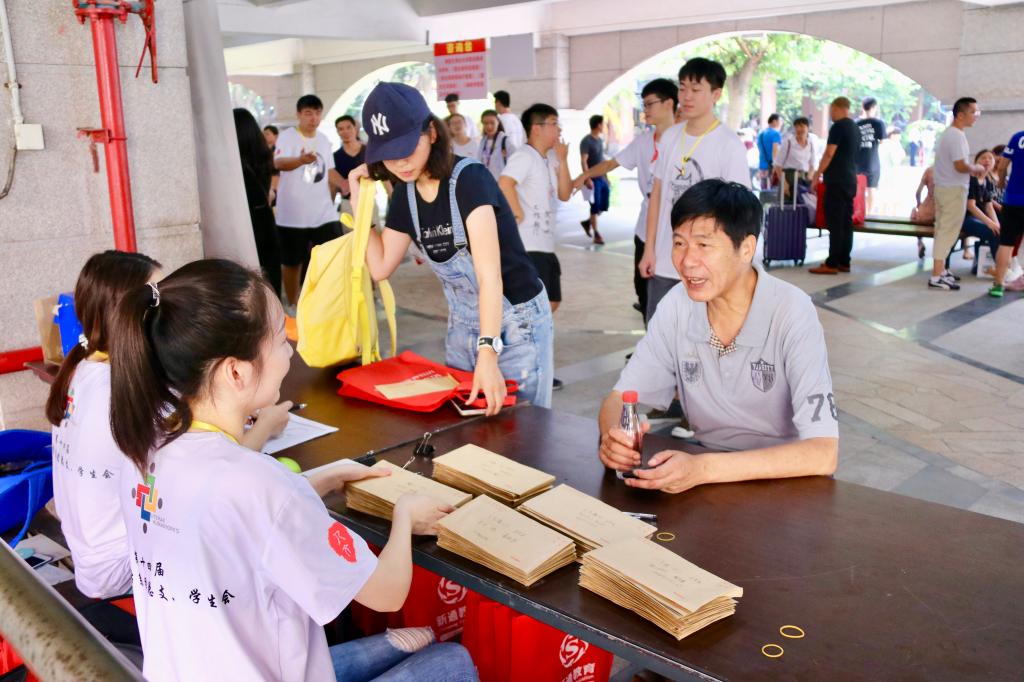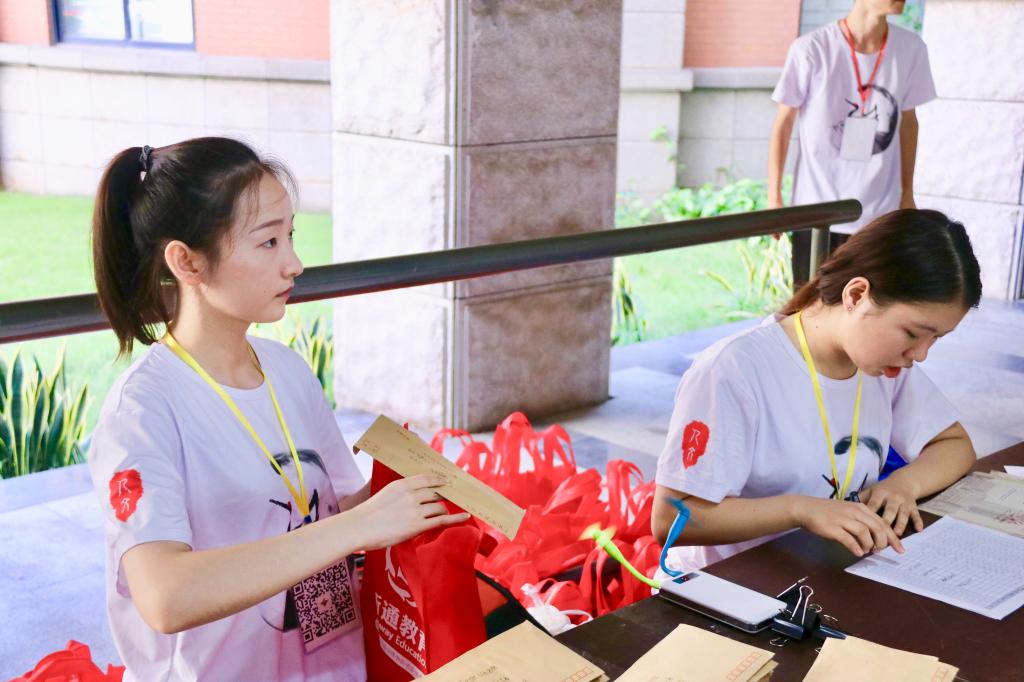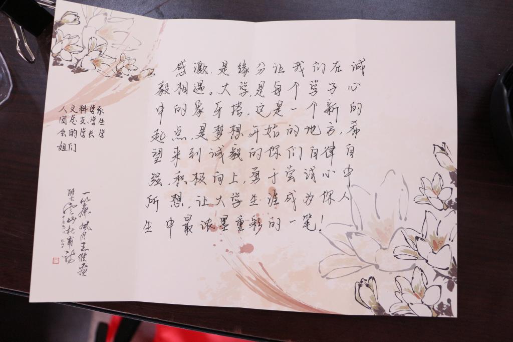 我系今年依然提出“请孩子们学会独立,自主报名”,为的是让新生们能适应大学生活,独立成长,同时也体现了我系迎新工作者的用心。而每年新生报到后都会有一份新生伴手礼,这也成为是人文科学系的一种传统。一瓶贴着“人文科学系”的水,盛夏里的一把扇子,一张详细的诚毅地图,给初入高校的新生们送去一份清凉的关怀。除此之外,今年每位新生都还收到一封特别的信,一封来自人文科学系学生会同学亲笔书写的信,一笔一划的用心,一字一句的关怀,人文科学系学生会延续着严谨踏实的人文作风,传承热情周到的人文关怀。作为迎新工作者的一员,社团成员们都提前3天来到学校参与工作培训,准备伴手礼和书信。学生会工作人员在迎新当天的清晨就开始布置迎新现场,以最热情的姿态为新生们指引,更是通过交谈等方式拉近与新生的关系,新生报道处的林同学说:“其实我想的就只是想给这些第一次离家的千禧宝宝们一种家的感觉,让他们感受到专属‘人文科学系’的关怀与温暖。”人文科学系学生会迎新工作者指引着初到诚毅的人文新生,用亲切的语言让新生们渐渐放下拘谨,帮助他们在迷茫中尽快地找到方向。一切工作都有条不紊、如火如荼地进行着。人文科学系团总支、学生会迎新工作分工明确、运行顺畅,圆满完成390名新生的报到工作。