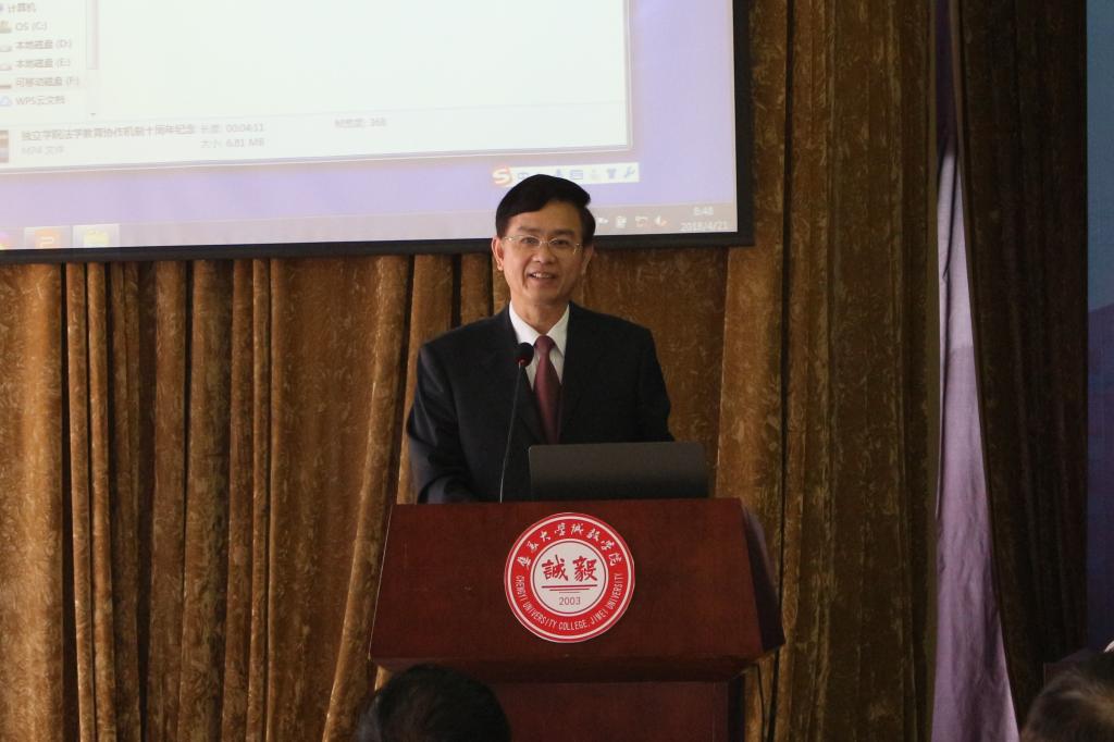 年会开幕式暨十周年庆典由集美大学诚毅学院法学教研室主任陈明祥副教授主持。集美大学诚毅学院院长叶光煌出席会议并致辞,他代表集美大学诚毅学院师生对会议的召开表示热烈的祝贺,对来自全国各位领导和专家的莅临表示热烈的欢迎,并向长期以来关心、支持和爱护诚毅学院各项事业发展的各位领导、专家、学者和老师表示诚挚的敬意和衷心的感谢!叶院长表示,诚毅学院以“嘉庚精神立校,诚毅品格树人”作为激励一代代诚毅师生严谨治学、诚信做人的精神源泉,推动诚毅学院向应用型大学不断探索与创新的不竭动力。最后,他预祝此次会议取得圆满成功!