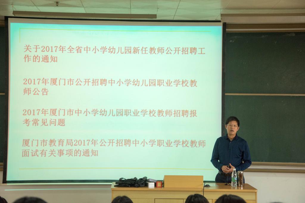 杨书松老师曾多次担任厦门市教师招聘考试的面试评委,对于教招的面试有着十分丰富的经验和独到的总结。本次讲座,杨老师分别从“考前准备”、“备考心态”、“教师基本素养”、“如何在面试中脱颖而出”等方面一一进行了详细独到的讲解。杨老师指出当前大学生就业形势不容乐观,教师岗位更是一职难求,因此前期准备和备考心态十分重要,一旦确定了目标就要扣紧考试的时间点,把握节奏,认真对待,尽最大的努力去争取。而针对大部分同学都较为关注的面试,杨老师提到面试是对考生专业知识和综合素质的检验,因此要想在面试中脱颖而出,除了要夯实打牢专业基础,提升自己的专业素养做好充分的准备工作之外还要具备片段教学应有的六大意识,在考试时学会通过展示自身亮点为自己加分,凭借新意让自己脱颖而出。最后,杨老师还用自己的亲身事例向同学们印证了考前准备足与考试发挥好相结合才是获得成功的保障。