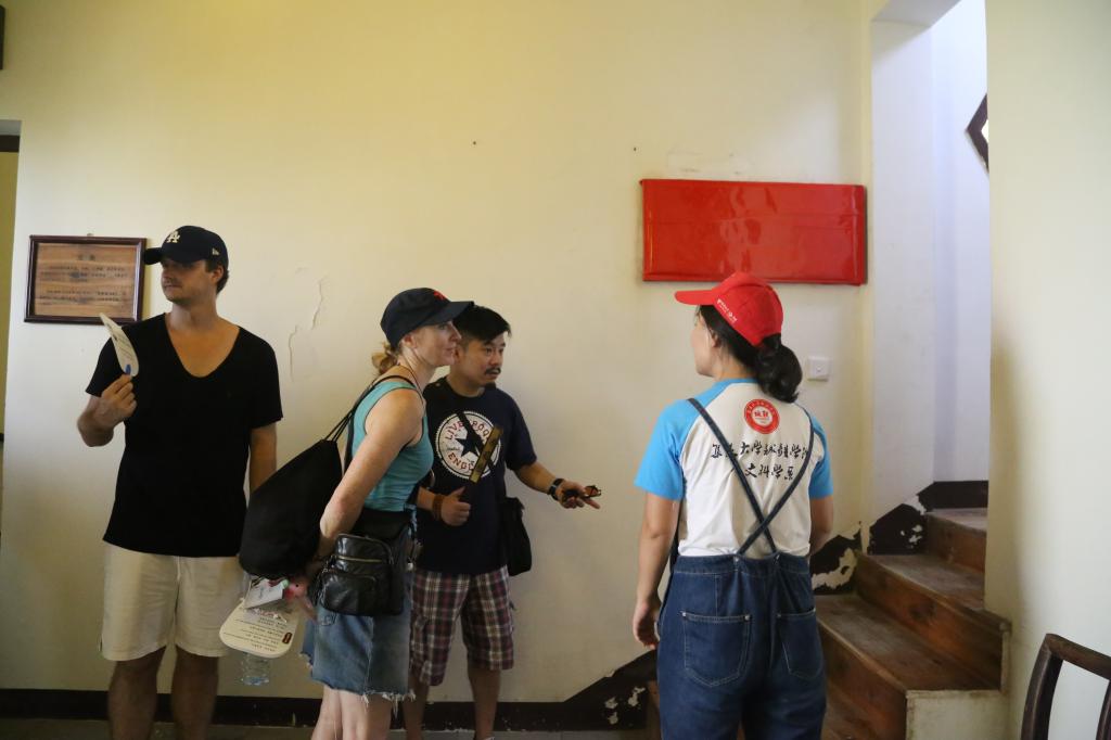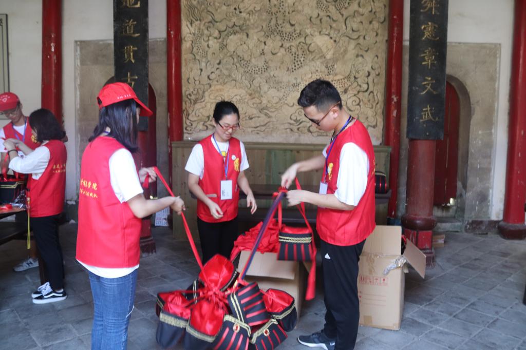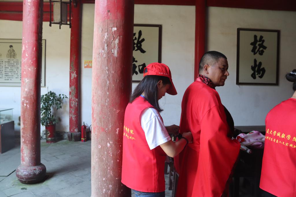 驻地兴贤书院与紫阳楼的志愿者们通过分发宣传手册和实地讲解具有代表性的朱子文化参观点向游客传递着朱子文化的博大精深。实践队员王宸悦说“能够在30多度的高温下,和队友们认真地为游客讲解景点,拿着相机为他们记录下讲解的瞬间;能够因为讲解不够完美而努力改进,也能够因为得到游客的称赞而兴高采烈是一种很棒的体验。”活动结束后,驻点兴贤书院的实践队员们在炎炎烈日下耐心等待,帮助政府收集活动服饰,细心清点,在堆积如山的衣服中,逐一分类出各种配饰、衣帽,即使扎在衣服堆里,队员们也不喊苦喊累,实践队员何蒙蒙说说道“天气炎热,但看到一个个游客或一对对新人在我们的讲解和服务下,能够更多地了解到朱子文化和荷花节圆满举办时,我便觉得一切辛苦都是值得的”。