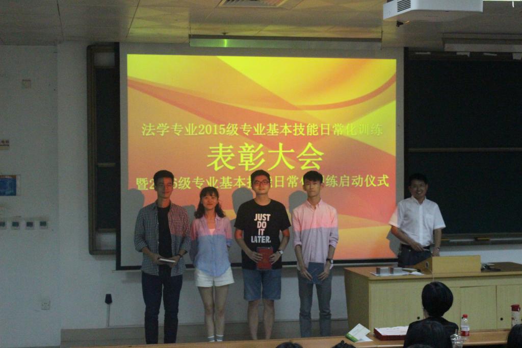 大会伊始,陈明祥老师首先对2015级法学专业学生在2015—2016度学年法学专业基本技能训练工作情况做了总结,并对2015级法学专业技能训练课优秀学生代表们提出了表扬,并由严倩老师、林锦静老师向14位获得“先进个人”称号的同学进行颁奖。在2015级的同学中,有三个带着理想与追求的同学在过去的一学年里创办了一个“理想国读书会”的微信公共号,主要是和大家分享一些有关于法律的随笔感言,陈明祥老师、孙群老师向这三位同学颁发“特别贡献奖”。