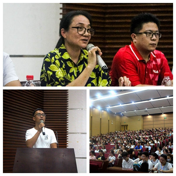| 上图:人文科学系党总支书记涂静萍老师在新生大会上讲话 左下:人文科学系团总支书记、2016级法学、英语专业辅导员毛春雷老师给新生部署近期有关工作 右下:人文科学系2016级新生大会和新生家长见面会现场 |