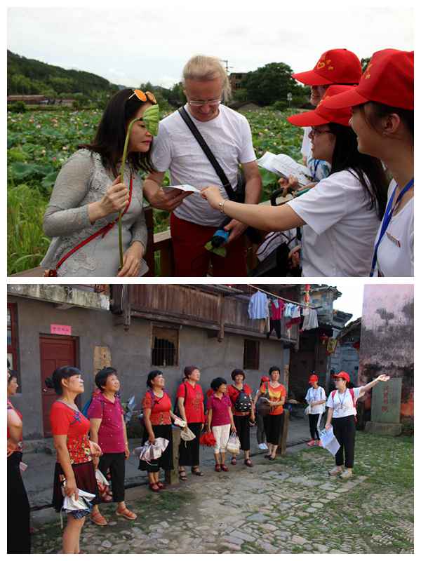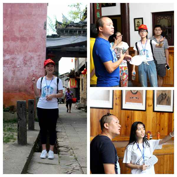 义务讲解志愿者分队的同学在那两天中是话最多的。他们从千年前的兴贤书院说到朱熹当年亲手植的香樟,他们从半亩方塘说到朱子故居紫阳楼。他们从“兴贤毓秀”说到“继往开来”,他们从门顶上的官帽说到大堂里的龙生九子图,他们从“韦斋”说到“晦堂”。他们告诉到那的人们“升高行远”也可以读作“远行高升”,他们告诉人们“双木林”加一个“土”读作“ye(第三声)”。他们还将难以理解的特有名词用英语解释给外来游客。当然,这些都不是他们从天而降的技能。在前期准备中,通过查询、咨询、整理、归纳出核心,何老师每天工作之余翻阅大量资料,参考权威翻译将难懂的、难讲的专有名词一个个翻译好,整合出中英文都有的导游词。整理好后讲解组的同学事先将这些导游词进行熟记甚至是背诵。去到五夫还特意向当地专门的工作人员咨询和学习。在即将讲解的前一天晚上,及时白天已经疲惫不堪,但仍旧一遍又一遍的练习第二天所讲的内容。正是因为这样的充足准备,这样刻苦的练习,才有了精彩纷呈的讲解,才收获了工作人员的赞同,游客的赞扬。