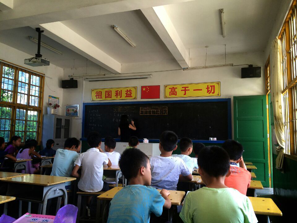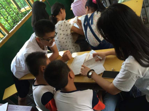 接下来的三天时间里,实践队员们开创‘以歌为引’的新式教学方法,分别以《童年》 《同一首歌》 《同桌的你》这些孩子们熟悉的歌作为语文课的开课导入,让同学们在音乐声中深刻记忆比喻,拟人,排比等修辞方法。被音乐包围的课堂里,同学们学习热情高涨,笑声阵阵。