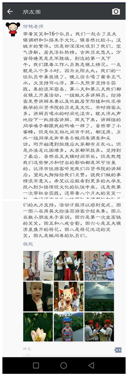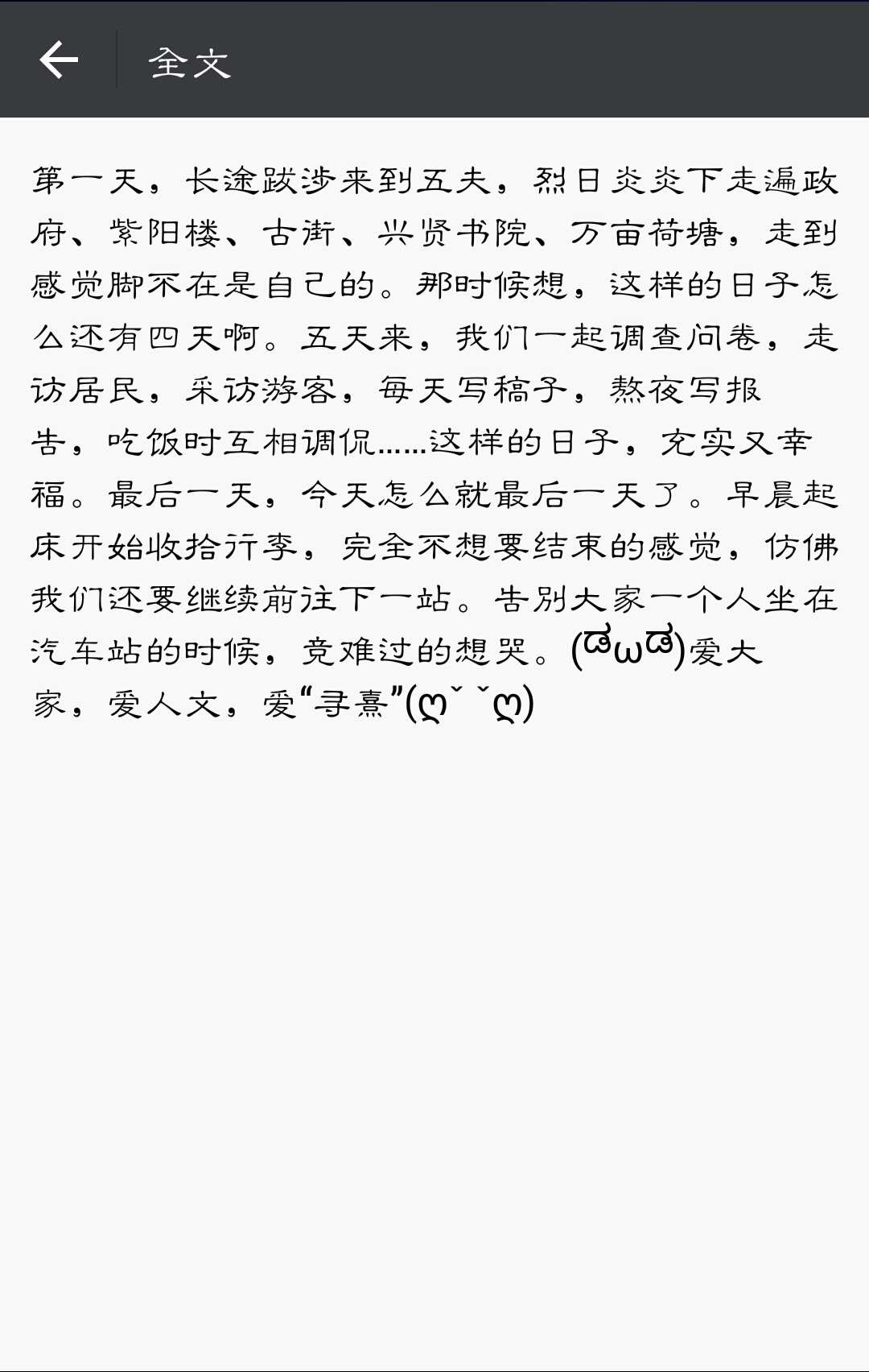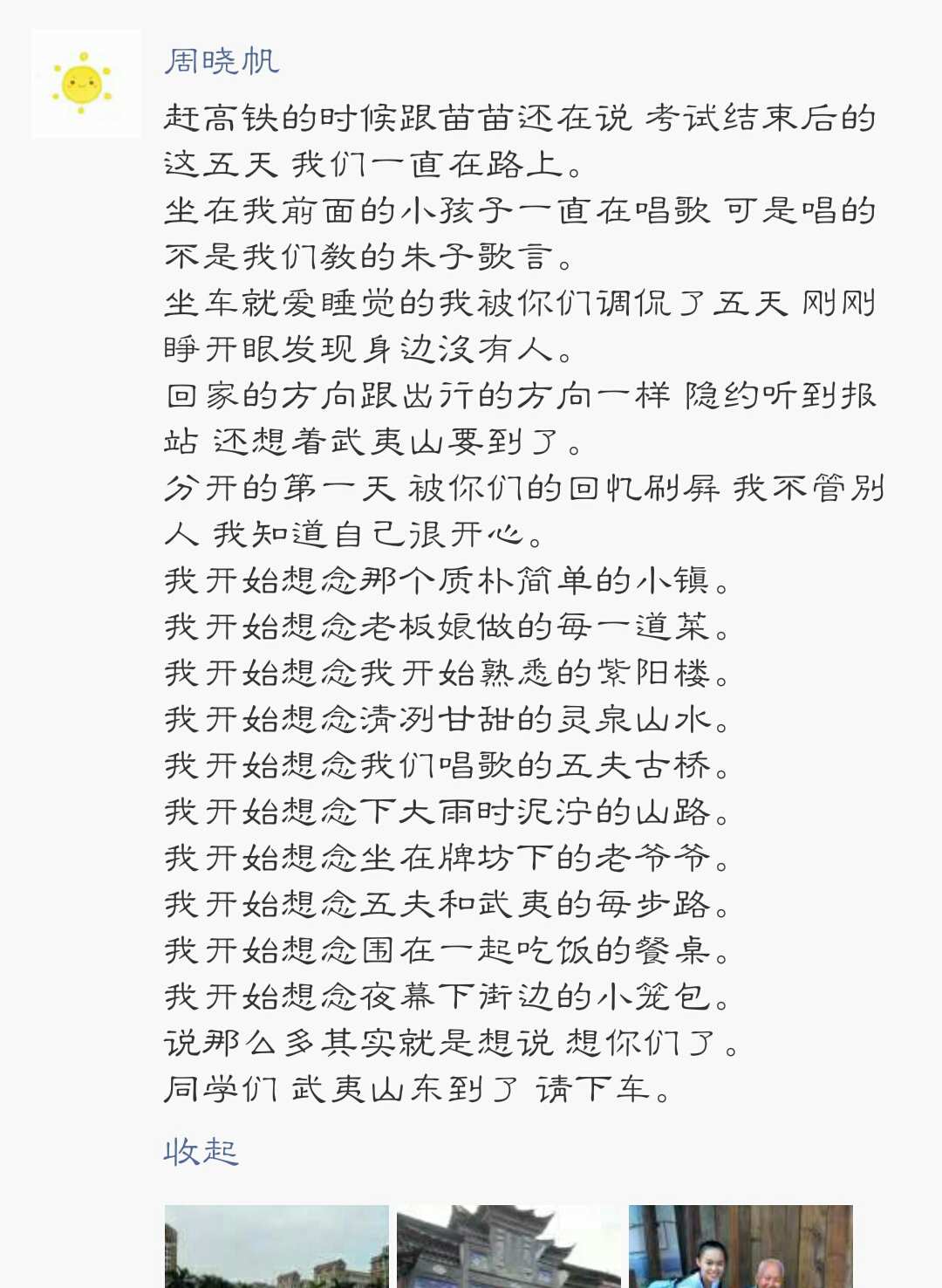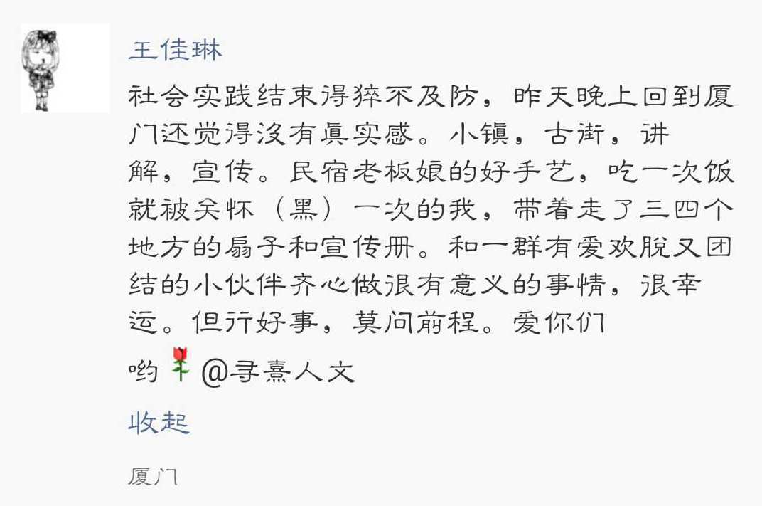 编者注:今天是“寻熹人文”实践队前一阶段实践全部结束的日子,实践队两名带队老师和十六名队员在之前的三个多月的时间里从策划到答辩到筹备再到开展具体活动,在锻炼能力的同时建立起了深厚的感情,五天的实践活动和一天多的材料整理到今天就算告一段落了,临别的不舍化作了大家朋友圈的点滴感悟,这是最真实的心得。这篇《分别后的第一天》是编者节选自队员周晓帆同学的朋友圈,短短的几行文字道出了所有队员此时的心声,本文标题为编者所加。