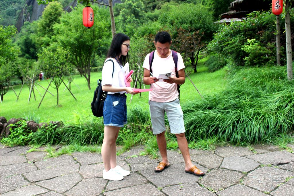 今天上午,两个带队老师以及队员中预备党员所成立的临时党支部和武夷山景区票务党支部一起进行“两学一做”活动,在景区内进行“文明旅游”的宣传以及捡拾垃圾,朱子文化的调研同时进行。景区内客流量比较大,问卷调研进展比较顺利。在调研过程中,遇到许多参加暑期夏令营的中小学生,从他们都会背的《观书有感》谈起,讲解朱熹以及朱子文化。队员们在景区党员的带领下前往武夷山景区中的朱熹园,天游峰分发文明旅游公约手册并且进行针对朱子文化的宣讲活动。下午两时许,队员们与景区工作人员一同前往绿野仙踪及天女峰义务捡垃圾,用实际行动维护武夷山景区的环境,用实际行动倡导文明旅游,用实际行动践行“清新福建,向上向善”。