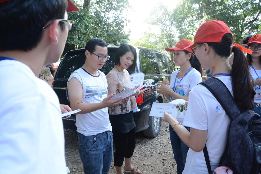 | 实践队带队老师和队员向五夫镇办公室主任介绍实践队制作的朱子文化双语宣传品 |