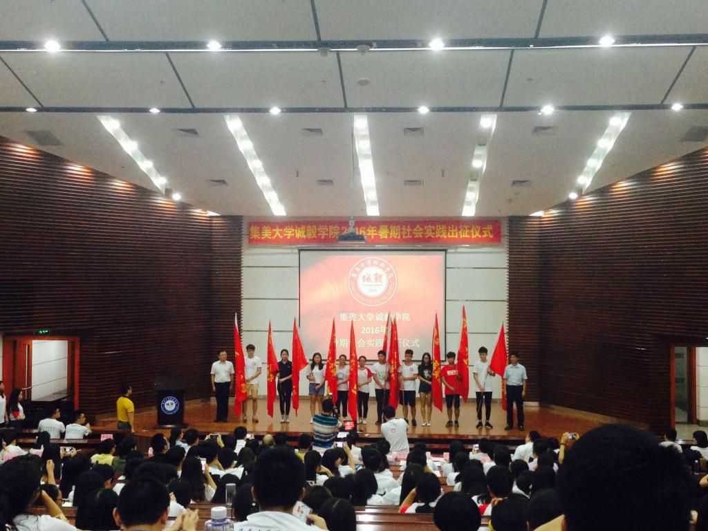 7月12日下午,集美大学诚毅学院2016年大学生暑期社会实践活动出征授旗仪式在学院景祺楼104报告厅隆重举行,我系“寻熹人文”实践队作为我系今年大学生暑期社会实践活动的代表参加了授旗仪式。