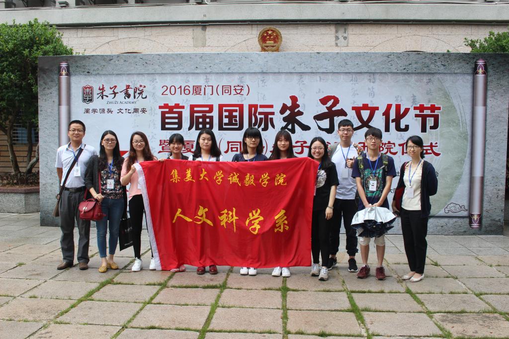 5月21日,人文科学系“寻熹人文”2016暑期社会实践队在人文科学系办公室主任靖耀老师、汉语言文学教研室徐晓元老师和辅导员张玉双老师的带领下前往厦门同安朱子书院参加2016厦门(同安)首届国际朱子文化节。此次文化节由中国朱子学会和福建省社会科学界联合会主办,世界朱氏联合会会长朱耀群、厦门大学校长朱崇实以及福建省、厦门市和同安区有关领导同志与海内外和两岸朱子文化研究专家学者、朱氏宗亲代表、厦门部分高校师生代表以及市民代表共同出席本次活动。