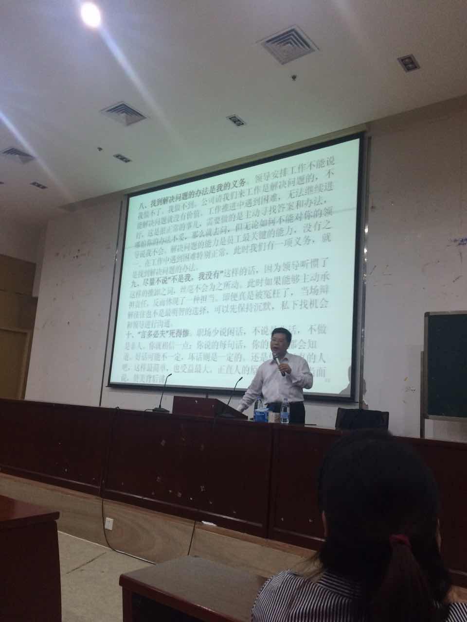 紧接着马洪斌先生围绕着进入职场后,如何适应职场展开。在职场上我们需要注重小细节,于细微处见精神。从说,听,看,思,情,拒六个方面去提升自己的职场的适应能力和增强自己的核心竞争力。同时还给了我们一些职场上的忠告,正确对待上司的批评,不要轻言辞职。