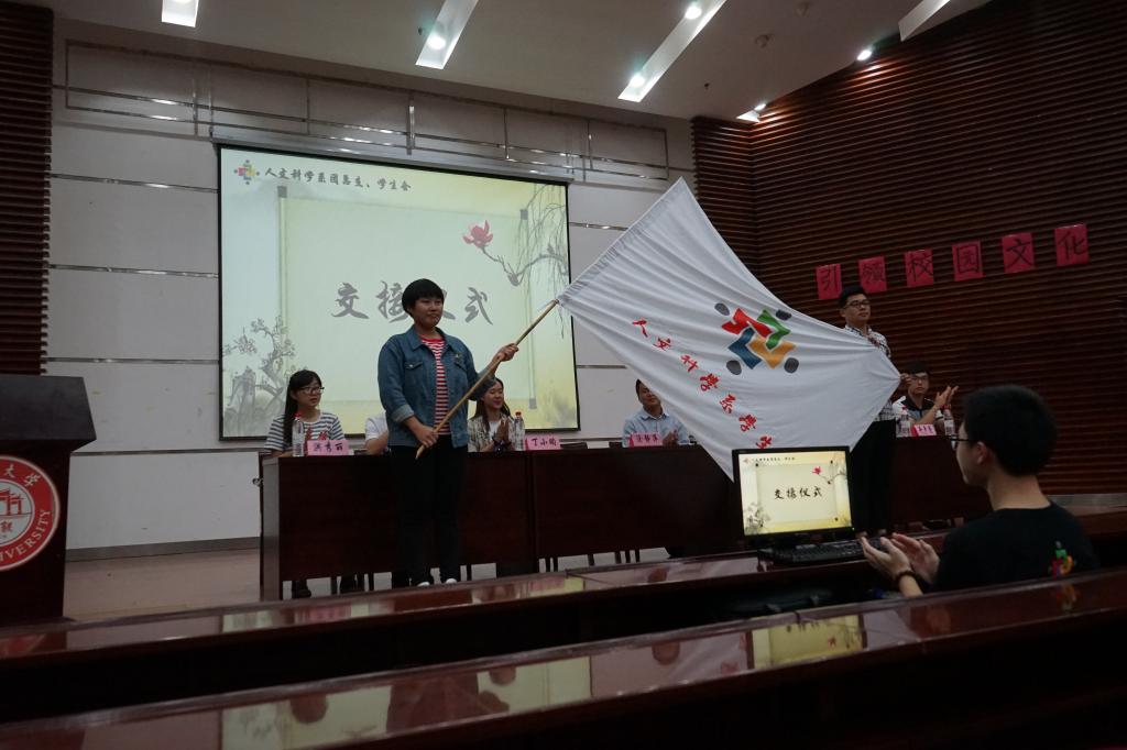 本次大会的最后,系徽交接的仪式在激扬的乐声和激烈的掌声中进行,系徽旗帜飘扬。第十一届人文系学生会成立大会落下帷幕,人文新十年的情怀却随之荡漾开来,久久不散。