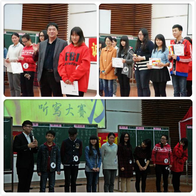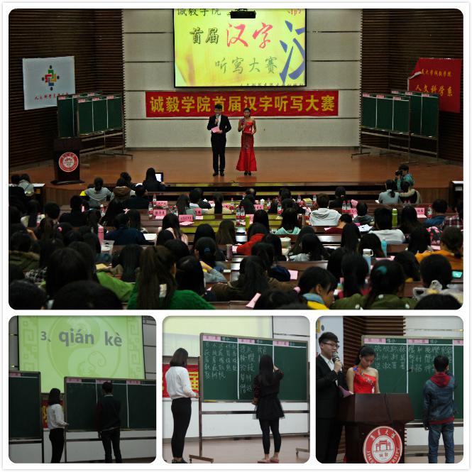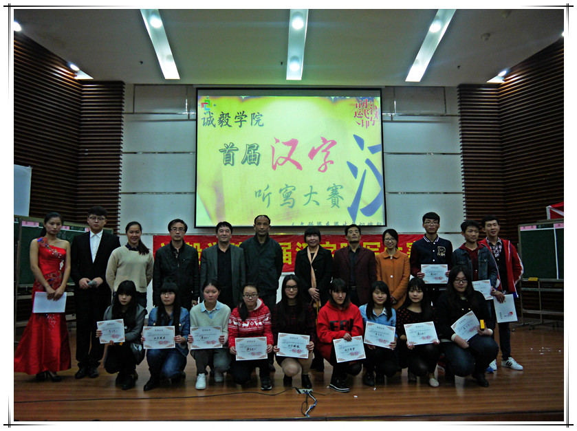 2014年12月15日晚,集美大学诚毅学院首届“汉字听写大赛”决赛在景祺楼104圆满落下帷幕。本次活动是人文科学系承办的我院普通话、规范字推广月系列活动之一。本次活动邀请了五位汉字先生现场评判,他们分别为集美大学文学院的郭焰坤教授、张克锋教授、陈光田教授、杨志贤副教授以及诚毅学院副院长朱宝荣教授。本次比赛的嘉宾有人文科学系办公室主任徐晓元,人文科学系团总支书记丁小昀,人文科学系系辅导员靖耀老师。