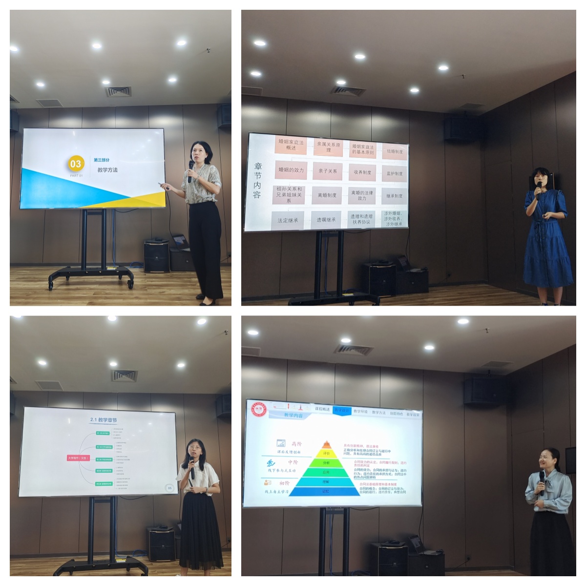 活动中,杨晓惠、王铭、方琳瑜、朱一青四位老师结合所授课程分别从课程概述、教学设计、教学方法、教学效果等方面进行了“说课”分享。杨晓惠老师以学生发展为中心,运用了自己的特色教学方法,征集“产业播报员”、组建“头脑风暴营”,努力提升学生创意思维能力,掌握创新创意技能;以文化自信为纽带,引导学生树立正确的社会价值观,激发学生的爱国主义情怀。王铭老师则把学生课堂与传统文化资源、红色资源相结合,开设了文创移动课堂与红色课堂,增强学生文化自信,培养学生爱国主义精神。方琳瑜老师牢固树立契约自由是《合同法》的灵魂和生命的观念,体会契约法中的人文主义色彩,加强培养学生法学职业技能的同时,提升思想政治素养,促进专业课程与思政教育的同频共振,培育品德高尚的法治人才。朱一青老师充分发挥激励的功能,在新文科教学改革中,不断激发学生的潜能,结合社会主义核心价值观,使学生树立正确的婚恋观。