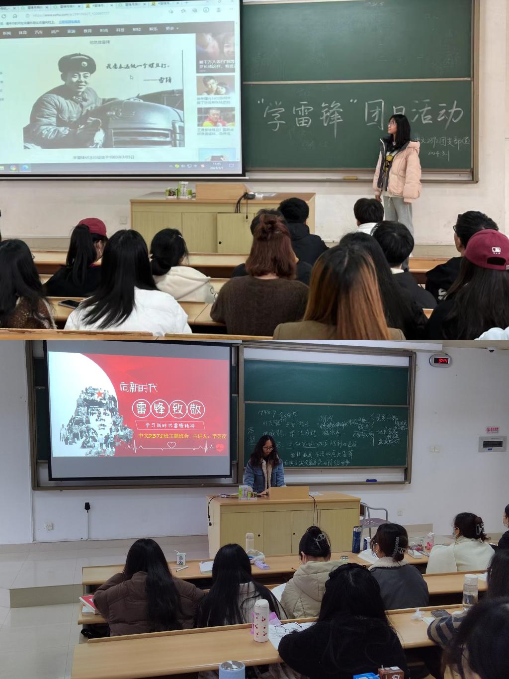 会上,各班级团支部在团支书的带领下,以身边人、身边事为例,讲述生动的雷锋故事,交流学习感悟。法学2395班团支部通过开展宣讲会和读书交流会,学习并总结雷锋精神的丰富内涵,挖掘雷锋精神新的时代价值,领会“坚持为人民服务”的学雷锋实践主旨。中文2194班团支部通过开展知识竞赛、诗词创作、志愿服务经验分享交流会等活动,大力弘扬“奉献、友爱、互助、进步”的志愿者精神,激励青年团员学习先进模范人物,发挥模范带头作用,争当时代先锋,将雷锋精神融入于日常学习、生活和工作中,努力成为有理想、敢担当、能吃苦、肯奋斗的新时代好青年。