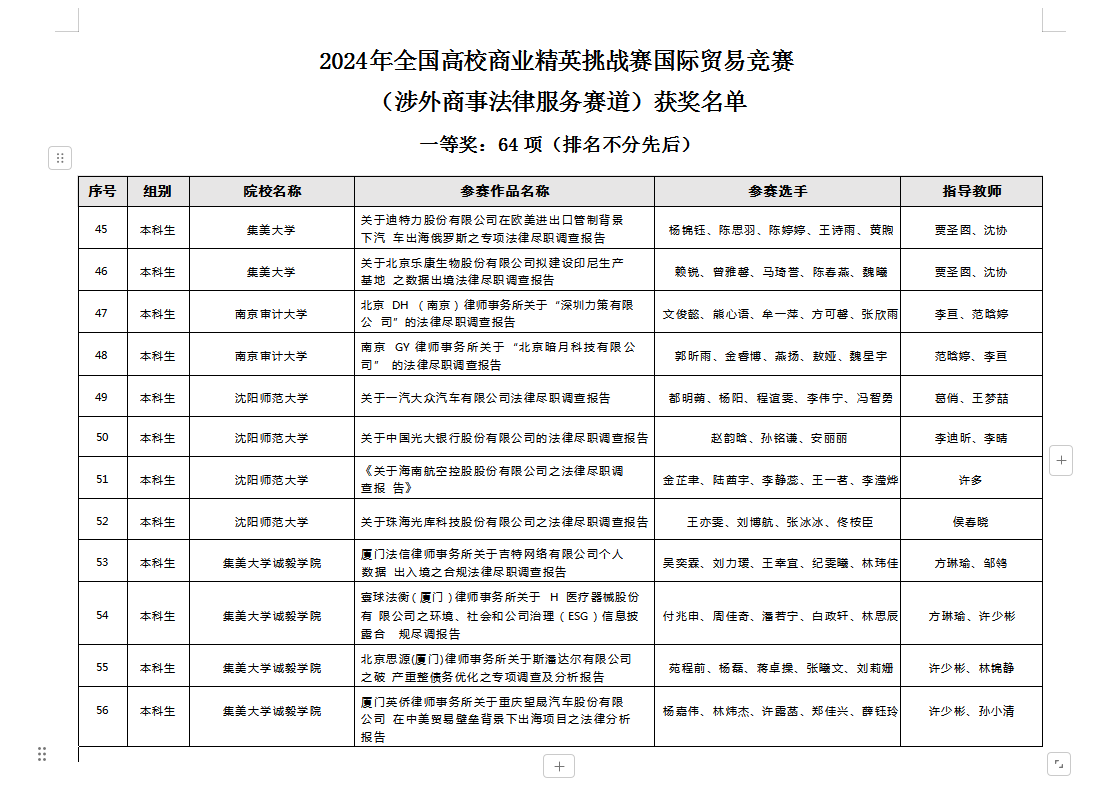 全国高校商业精英挑战赛国际贸易竞赛涉外商事法律服务赛道,是专门为涉外法治人才提供的竞赛、实践和交流平台,同学们在参赛过程中能够切实提升法律文书写作、涉外法律检索、团队协作、展示汇报等技能,对于应用型、创新型和复合型涉外法治人才培养和促进学生就业具有重大意义。本赛道本科组共评选出一等奖43项,二等奖项60,三等奖55项。