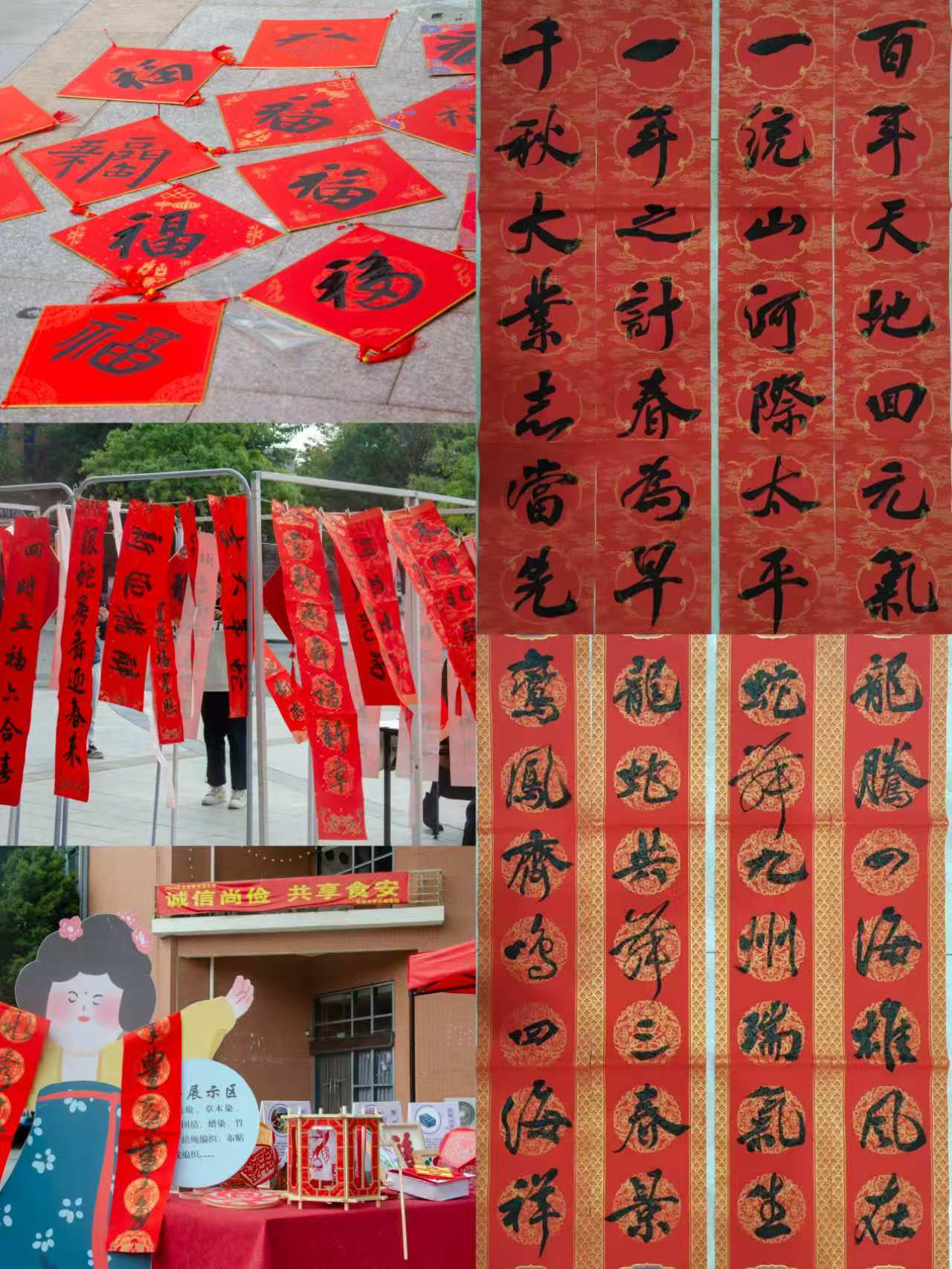 活动现场设置了师生书写区、书法展示区、文创产品展区、社团游戏区。现场,集美区知名书法家骆良彬、詹永昭、叶清水、饶泽来与我院墨缘书法协会同学们一道倾情挥毫,师生们纷纷驻足围观、观摩品味。“一年之计春为早,千秋大业志当先”、“龙腾四海雄风在,蛇舞九州瑞气生”……一副副春联、一张张“福”字,不仅寄寓着对诚毅师生员工们的美好祝福,也激励着新时代青年文以载道、挺膺担当,更好地坚定文化自信、传承中华优秀传统文化。活动现场气氛热烈,欢声笑语不断。墨缘书法协会社长李欣雨表示,此次活动旨在引导师生现场挥毫、以墨传情,感受中国书法之美。在新年来临之际,以春联和“福”字为载体,传递美好祝福,为校园文化建设增添色彩。法律践行社、深水港文学社、伍侯国学社、Magic star音乐唱作社等学生社团现场助兴,送上了形式多样的表演与展示。活动结束后,墨缘书法协会为学院领导、后勤工作人员们送去春联、斗方,传递新年的温暖与美好祝愿。