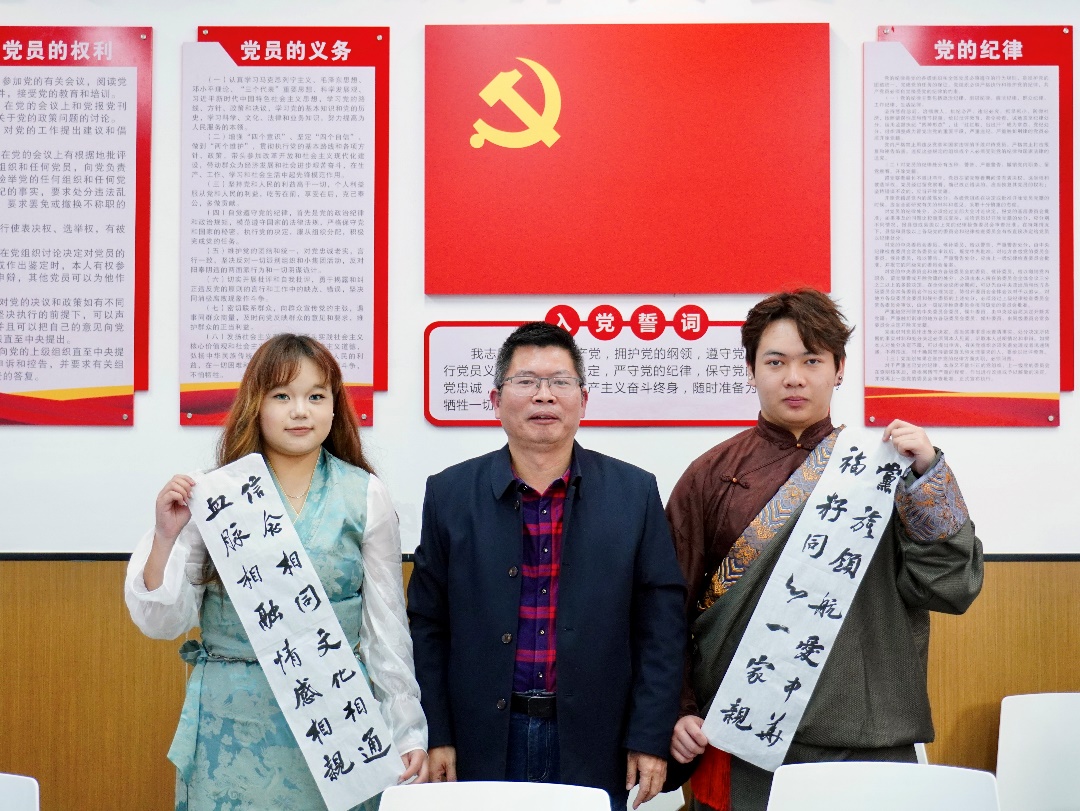 总结发言环节,许弘明以激昂的《爱我中华》旋律为引,结合“信念相同文化相通,血脉相融情感相亲”“党旗领航爱中华,福籽同心一家亲”“党旗领航讲好人文故事,文以载道塑造诚毅人生”三幅书法作品,深入浅出地阐述了共同信念与文化交流在民族团结中的基石作用。他深情寄语青年学子积极融入集体,不断增强民族团结意识,不仅要把民族故事讲得精彩动人,更要将其转化为实际行动,在日常生活中践行民族团结的理念。他细数了文明校园创建、学科竞赛、就业创业、导师制等当前重点工作的推进情况,鼓励大家以“功成不必在我,功成必定有我”的信念,主动规划作为,讲好人文故事,展现积极向上、团结奋进的精神风貌,为校园文化建设和民族团结进步事业贡献自己的力量。