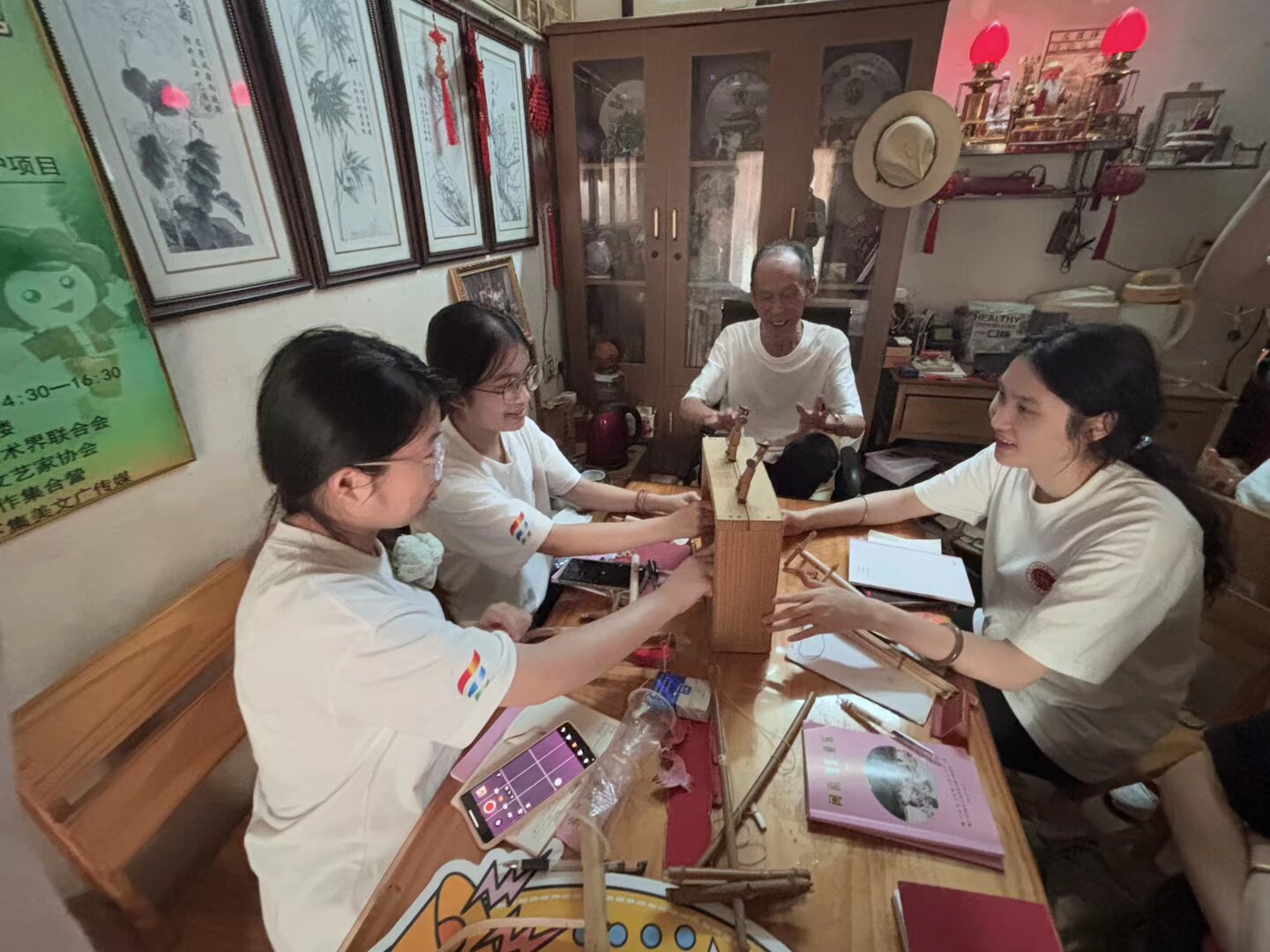 在灌口镇深青村闽南童玩非遗传承人林得时的家里,实践队员们沉浸式研习了闽南童玩文化的精髓。林得时老师详尽介绍了闽南童玩的历史传承和制作方法,让实践队成员们对童玩的概念有了新认识。林老师收集、记录、制作濒临失传的闽南传统儿童游戏,将传统童玩与现代教育相结合,让古老游戏焕发新活力,促进非遗活态传承。除此之外,他还向实践队展示了许多自己制作的童玩,并指导队员亲手制作。以闽南童玩为载体,林得时不仅守护了一方文化根脉,更通过创新让传统融入现代生活。他的贡献超越了游戏本身,体现了非遗保护中“以人为本,活态传承”的核心精神,对民间文化的可持续传承具有示范意义。在此次访谈中,队员们感悟了传统智慧的魅力,深刻认识到将童玩元素融入学科教学的意义,这不仅是对传统非遗文化的创新传承,更是激发教育活力的有效途径。
