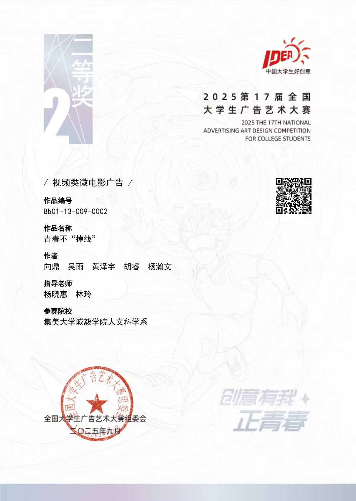 其中,由人文科学系和管理系学生共同创作的视频广告作品《青春不“掉线”》,以独特的视角聚焦年轻一代的生活状态,通过沉浸式叙事与视觉符号创新,生动诠释了中国联通的商业价值与人文温度,获评委一致好评,最终摘得全国二等奖。该作品主创向鼎同学表示:“大赛让我们实现了从课堂理论到实战应用的转化,感谢学校提供的平台和老师的悉心指导,未来将继续在创意领域深耕探索。”