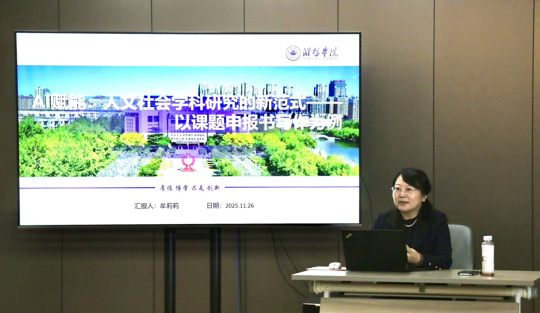 讲座结束后,牟莉莉教授应邀前往景祺楼8楼教工之家,为人文科学系全体教师带来“AI赋能:人文社会学科研究的新范式——以课题申报书写作为例”的专题分享。牟教授围绕人文社科研究的痛点与难点,深入探讨了AI技术在研究选题、文献分析、理论构建、挖掘创新点等方面催生的新范式,结合政策阐述其对学术创新和跨学科研究的重要推动作用;通过具体课题申报案例演示与实操教学,她详细讲解了如何运用AI高效完成文献综述、凝练研究框架、润色文本等工作,指导教师们将AI转化为课题申报全流程的智能学术助手,助力科研工作提质增效。