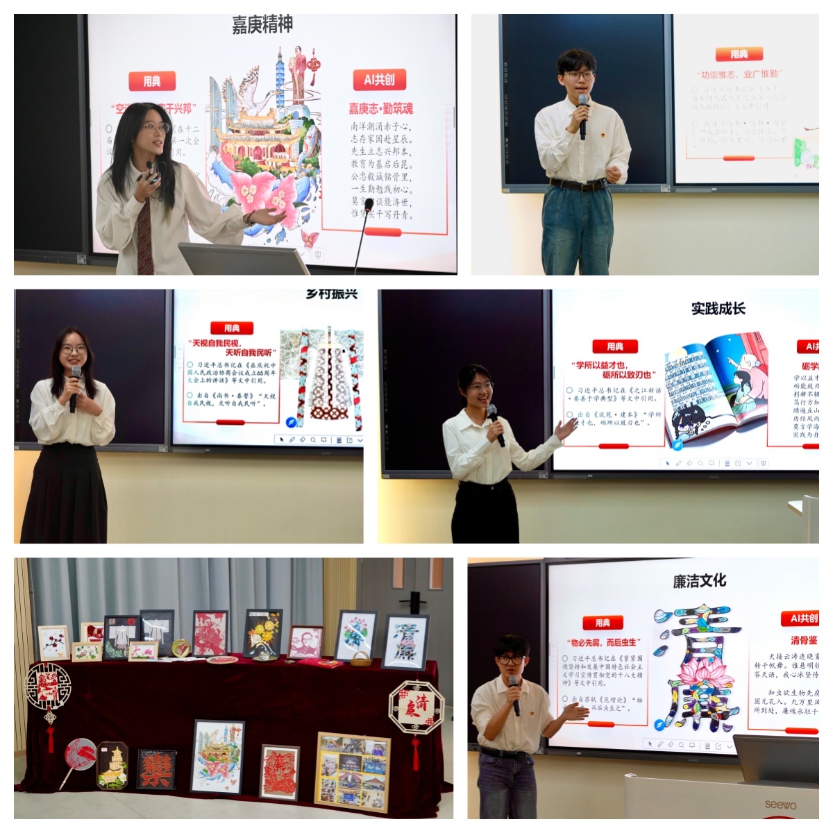 青春诠释理想,文化传承薪火。由人文科学系学生第一党支部党员组成的《习近平用典》宣讲团分享了“用典”学习体会。他们从“嘉庚精神、廉洁文化、实践成长、乡村振兴、青春担当”五个方面,结合AI共创诗词及中文专业(文创方向)学子手工制作的非遗文创作品,讲述着自身感人的实践成长故事,生动诠释了“空谈误国,实干兴邦”等用典的时代内涵,展现了人文学子的责任与担当,更是中华优秀传统文化创新性传承的具象化呈现。